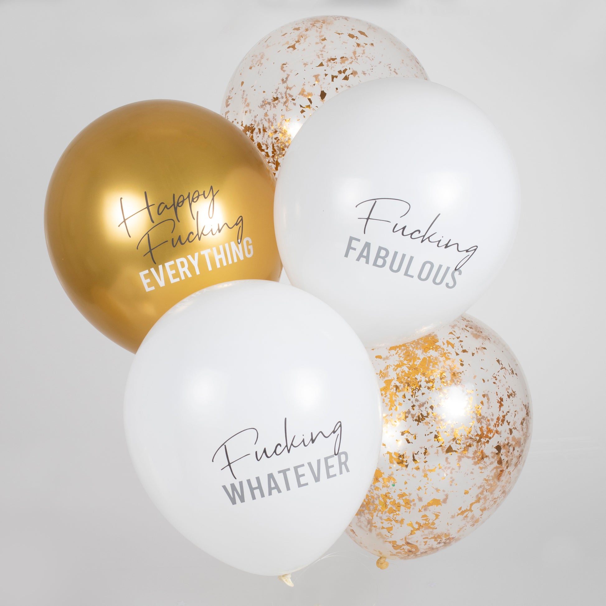 These naughty adult party balloons can be enjoyed at any celebration and with the mix pack of White & Gold balloons, they'll add a fun pop of colour to your party. Why not pair alongside the matching Happy Fucking Everything Bunting to complete the look.
