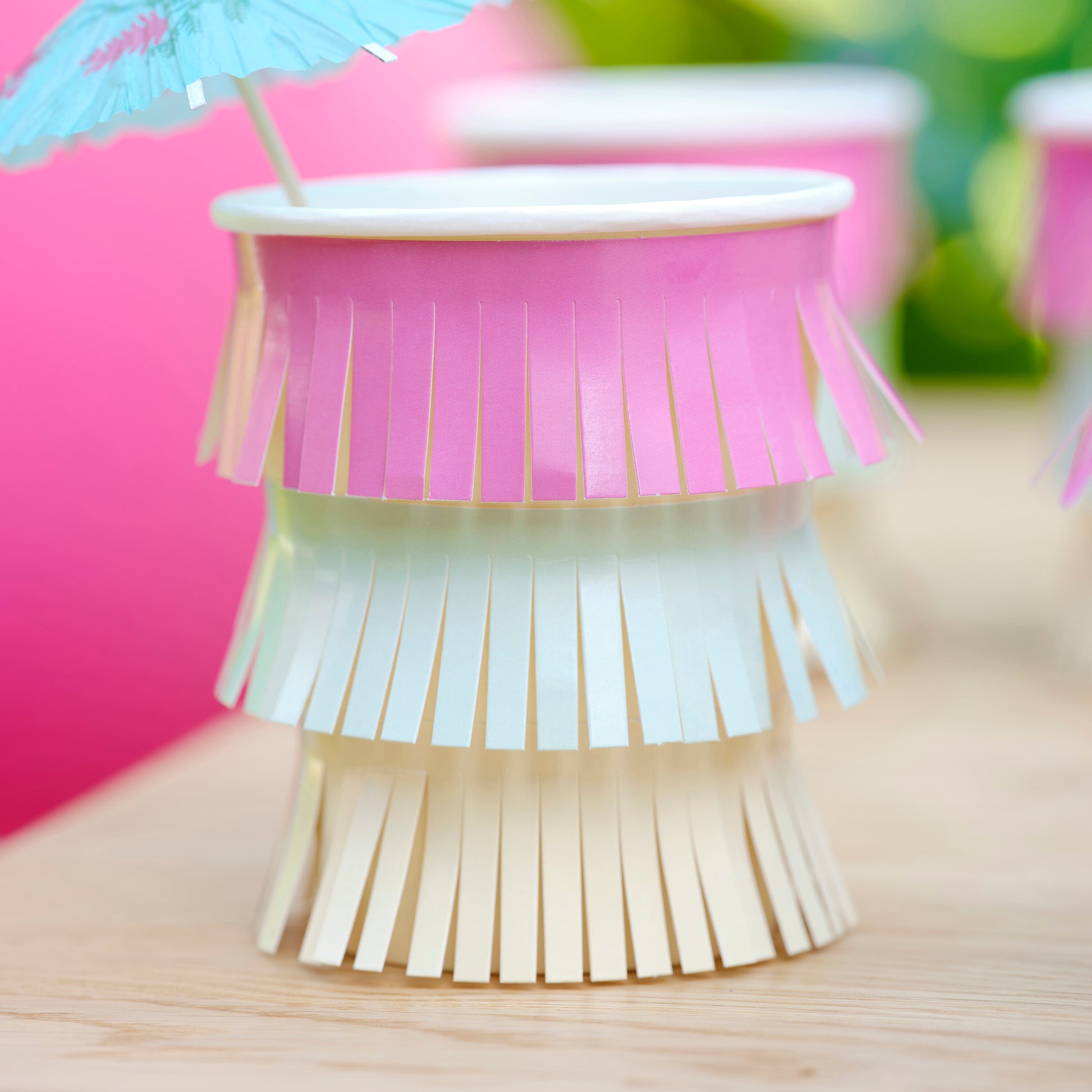 Each pack contains 8 x party cups with pink, green and yellow fringe.