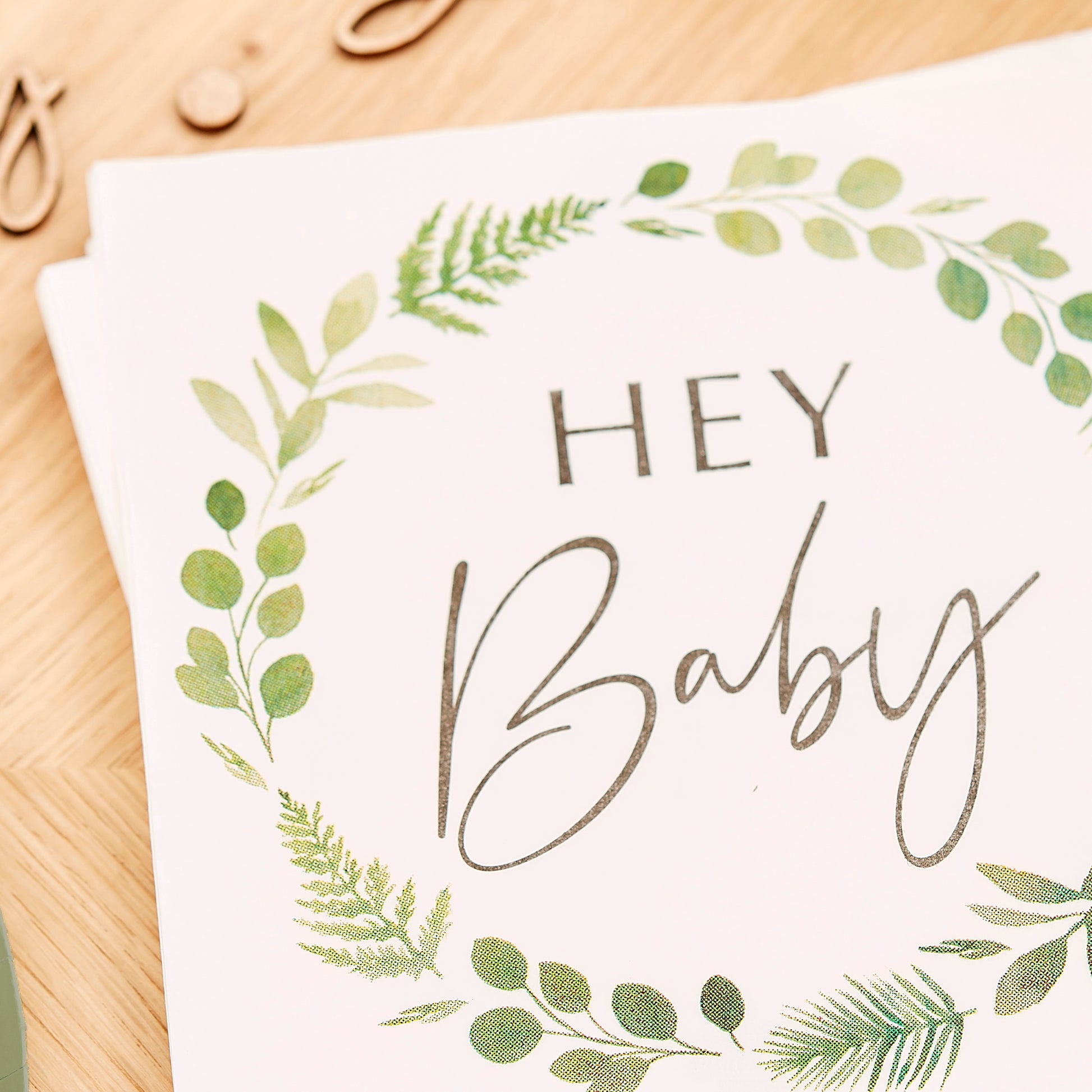Keep it natural with our eco-friendly baby shower tableware! - these gender neutral hey baby foliage design baby shower napkins will suit any theme!
