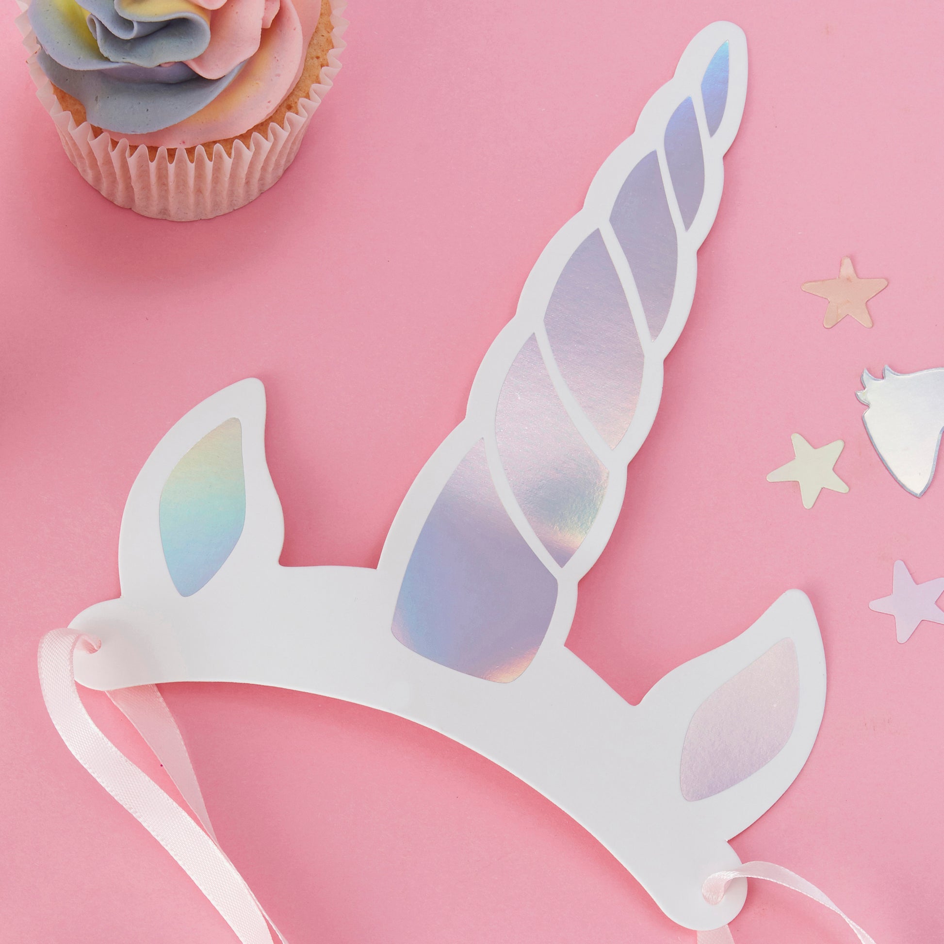 Guests can tie these fabulous 'Unicorn Horn Headband' hats around them to become real life unicorns! The iridescent foiled horn and ears will make you sparkle with magic as your guests turn into mystical unicorns! A fun way to transport your guests to a far away land full of enchantment!