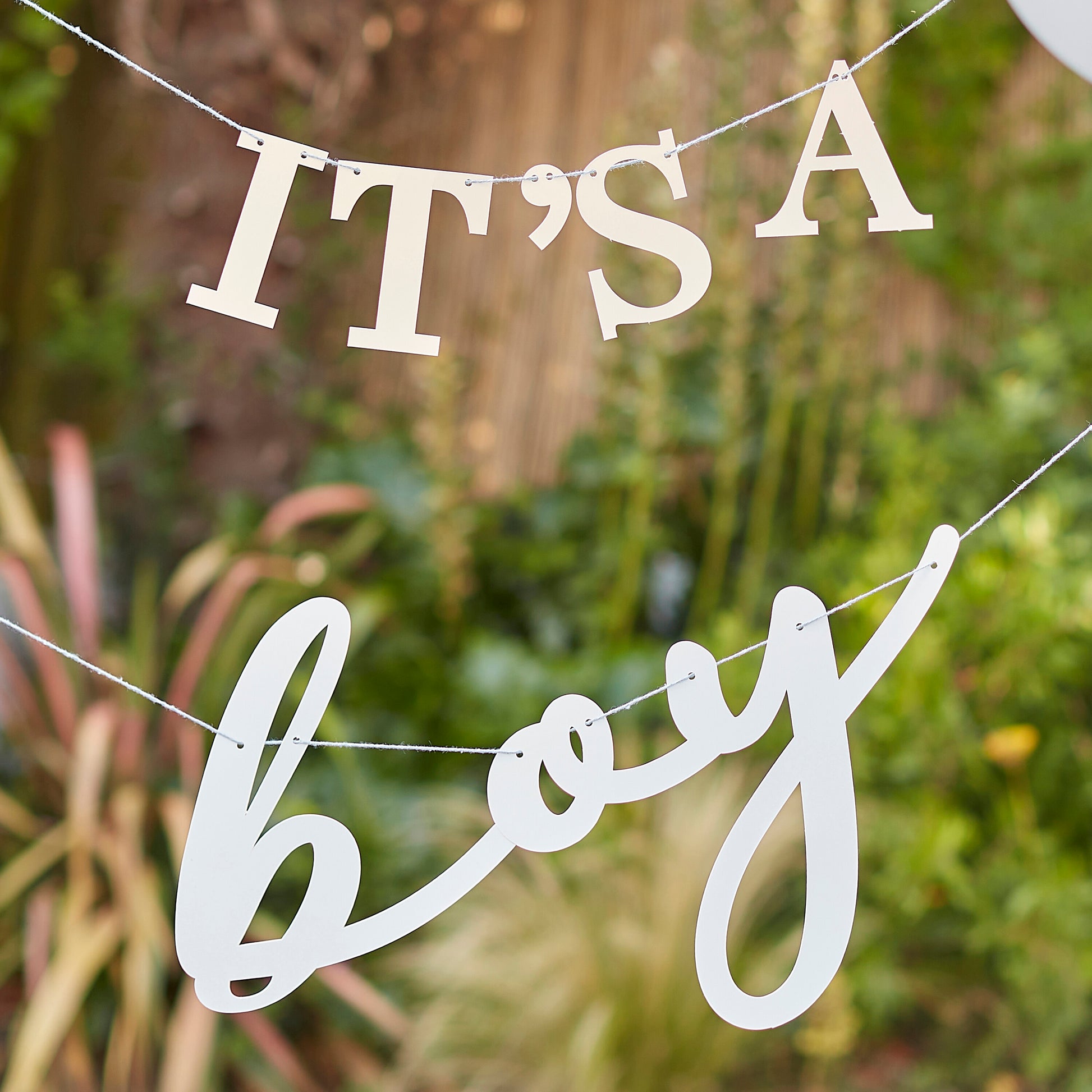 Style your baby shower or gender reveal party with this pretty 'It's A Boy' bunting. Decorated with a stylish white and baby blue colour scheme, this baby shower bunting is perfect for decorating in your home or at a venue for a lovely display.