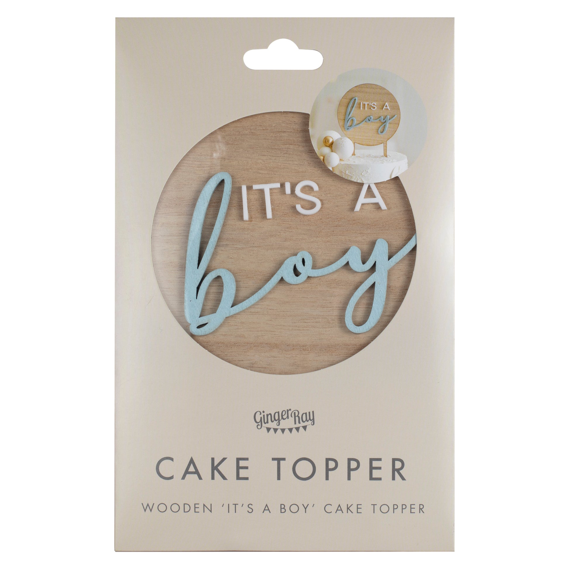 1 x wooden 'It's a boy' baby shower cake decoration, measuring 17.8cm (H) x 12cm (W). Cake topper spikes measure 6.5cm (H)
