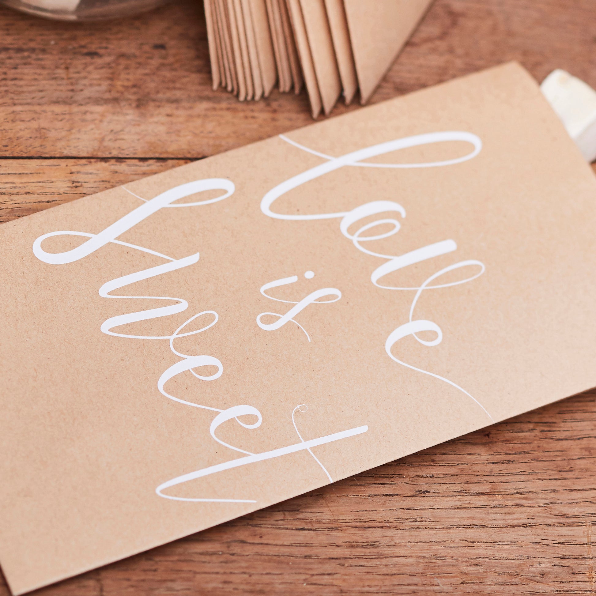 Add the perfect touch to your reception with our wedding favour sweet bags in rustic country kraft paper. Guests of all ages will love filling these up with delicious sweets - a real treat to spoil your guests. The white scripted writing will look beautiful upon your sweetie table - totally irresistible.