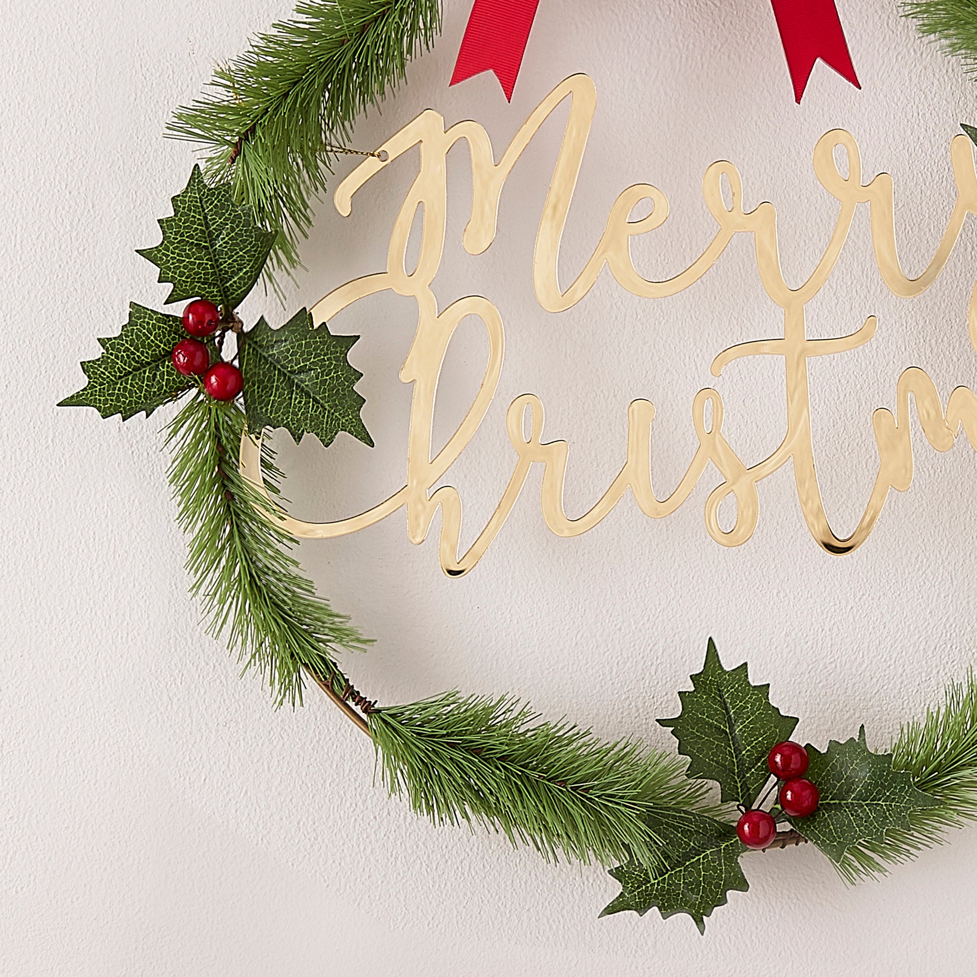 The quintessentially traditional style wreath features artificial fir foliage, artificial hollies and berries, 'Merry Christmas' sign in acrylic and completed with a festive red grosgrain ribbon bow. Perfect for above a mantlepiece or on a door the wreath comes with a length of gross grain ribbon to attach.