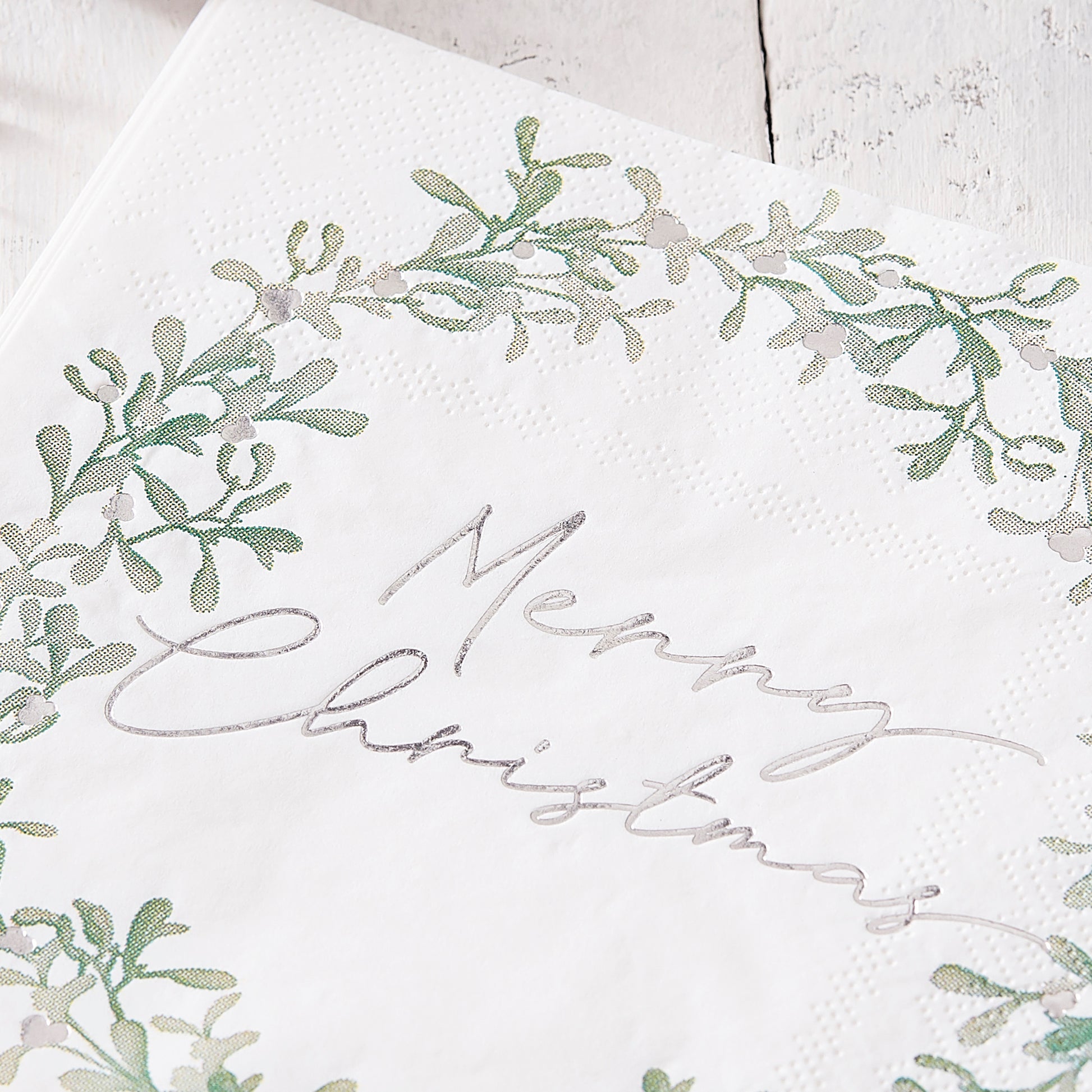 These paper napkins will be an elegant addition to your table settings this Christmas. The watercolour mistletoe wreath design is beautifully delicate and is finished with the stunning silver scripted foil in the centre to give the 'Merry Christmas' message.