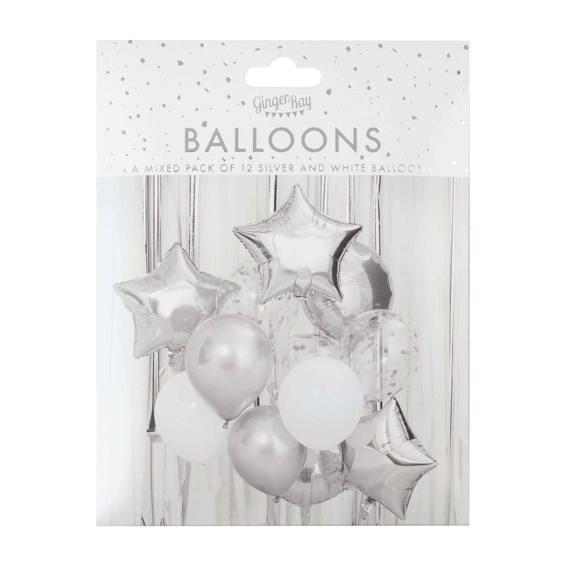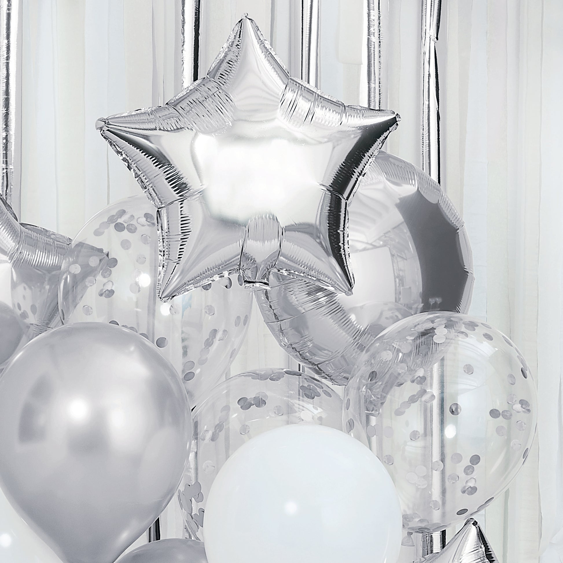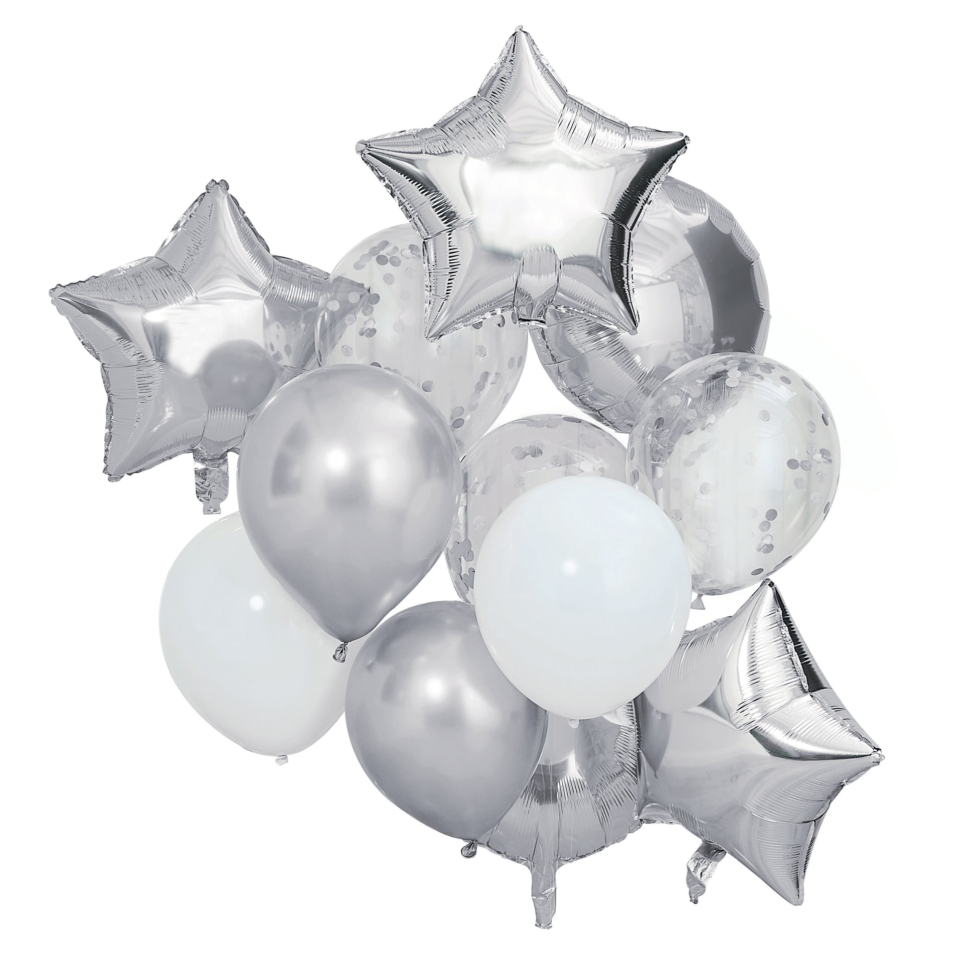 Each pack contains 3 x 18 inch star foil balloons 2 x 18 inch round foil balloons 2 x 12 inch silver chrome balloons 2 x 12 inch White balloons 3 x 12 inch Clear confetti balloons
