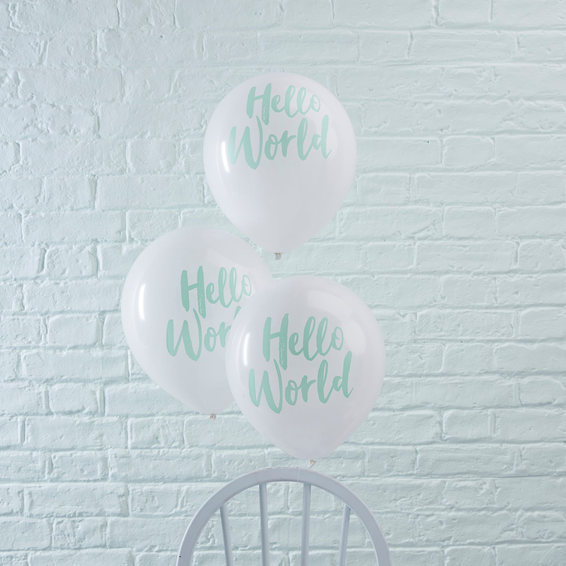 Lovely white and mint green Hello World Balloons, perfect for creating a trendy Baby Shower set-up. Combine the mint green balloons with rose gold elements of the Hello World range to welcome your baby into the world!