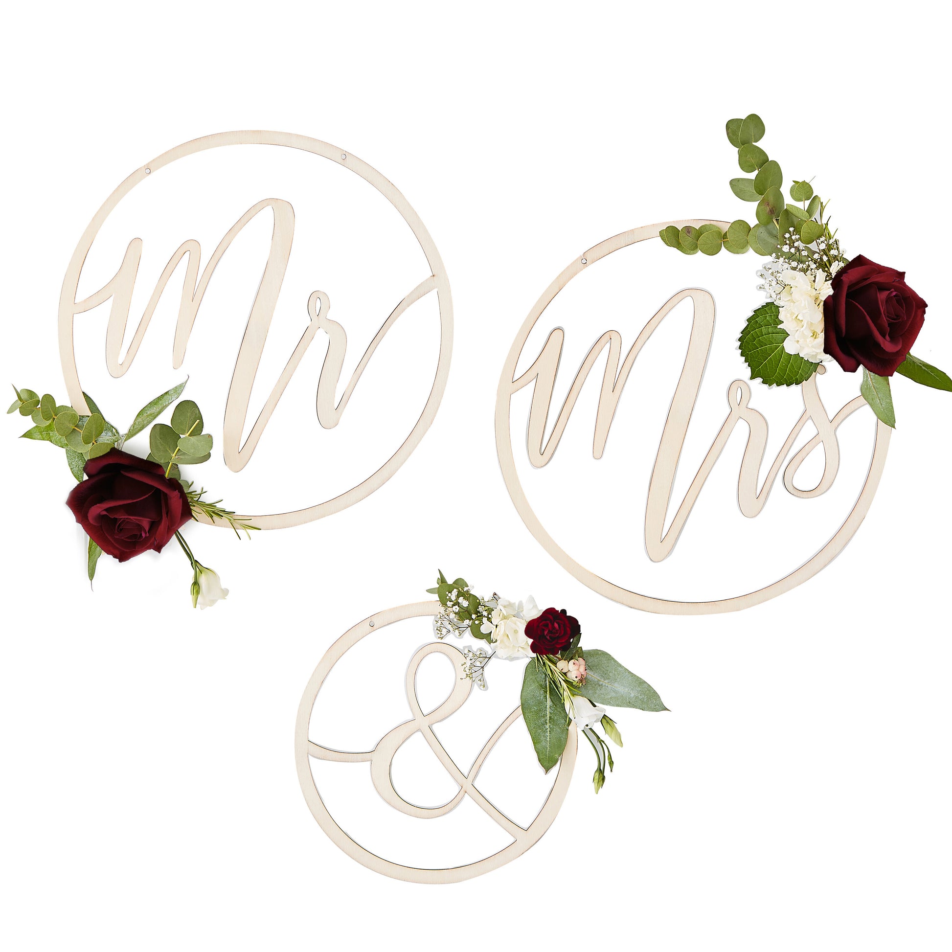 Create a stunning focal point or background on your big day with these wooden Mr and Mrs floral hoops. Perfect to wrap your favourite flower or foliage around the scripted letters to suit your autumn wedding theme.