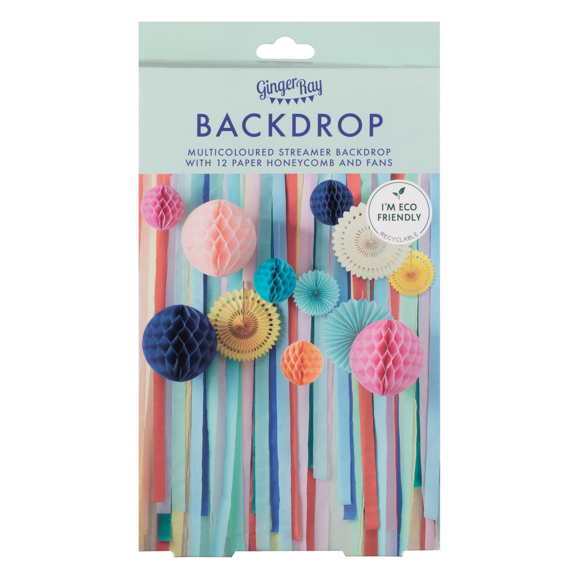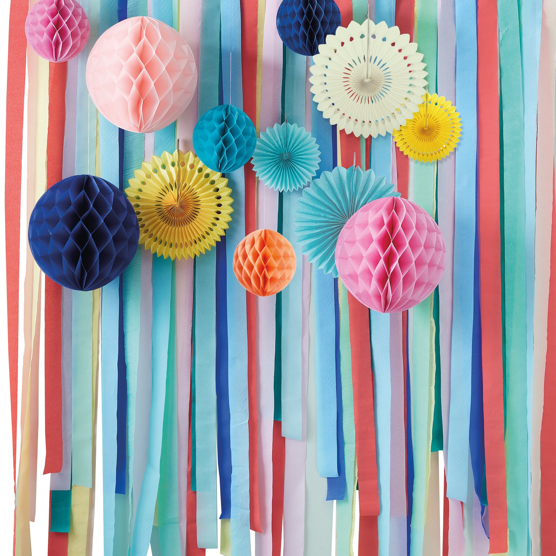 Multicoloured Streamer Backdrop with Honeycombs and Fans