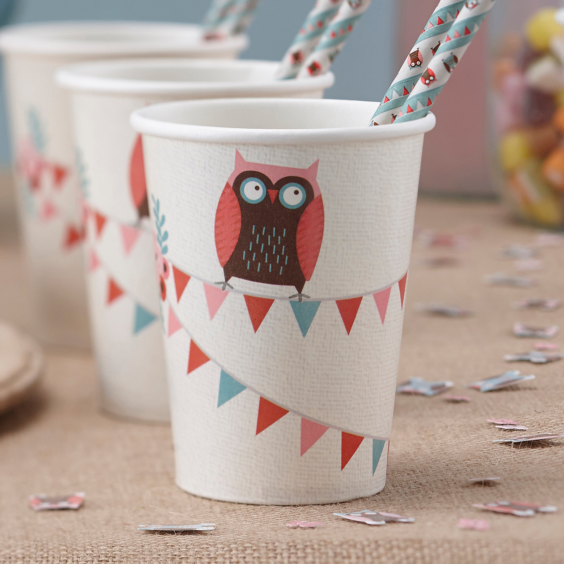 Our cups come as a pack of 8 with a textured cream background and patchwork owls circling the cups. 9oz in size.