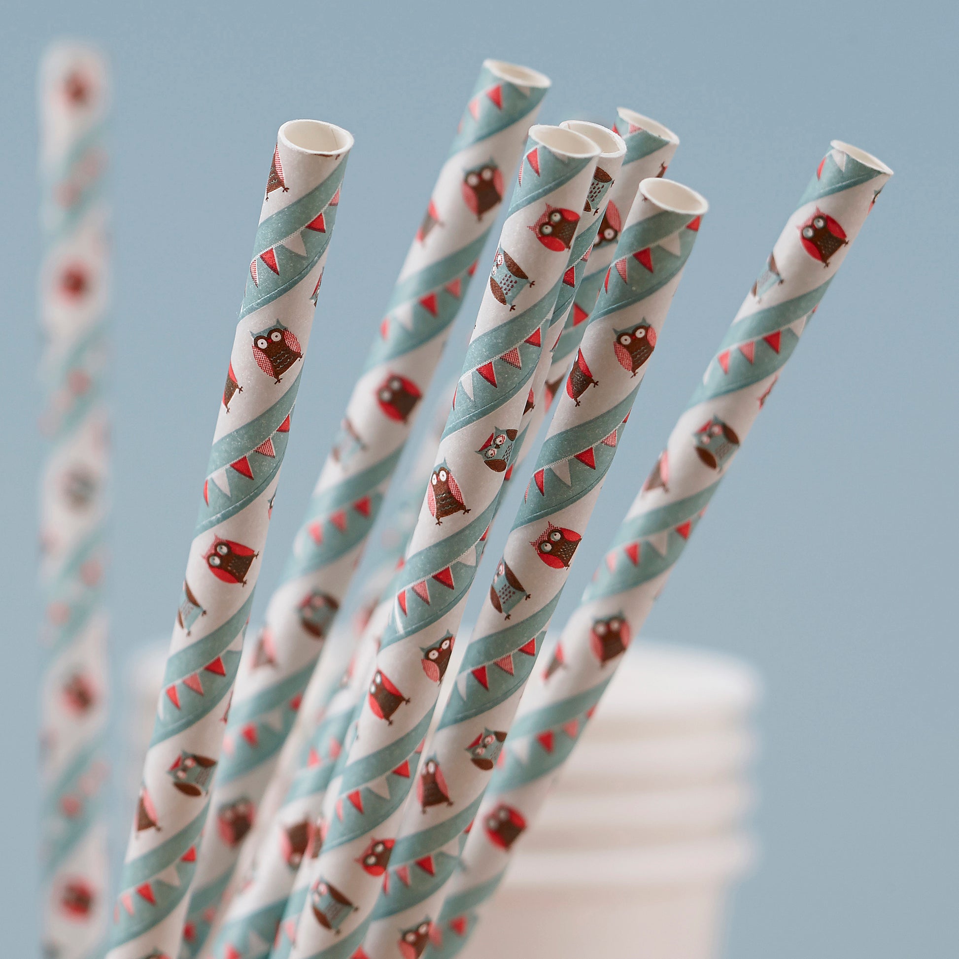 A pack of 25 vintage paper straws with owls and bunting running through them.