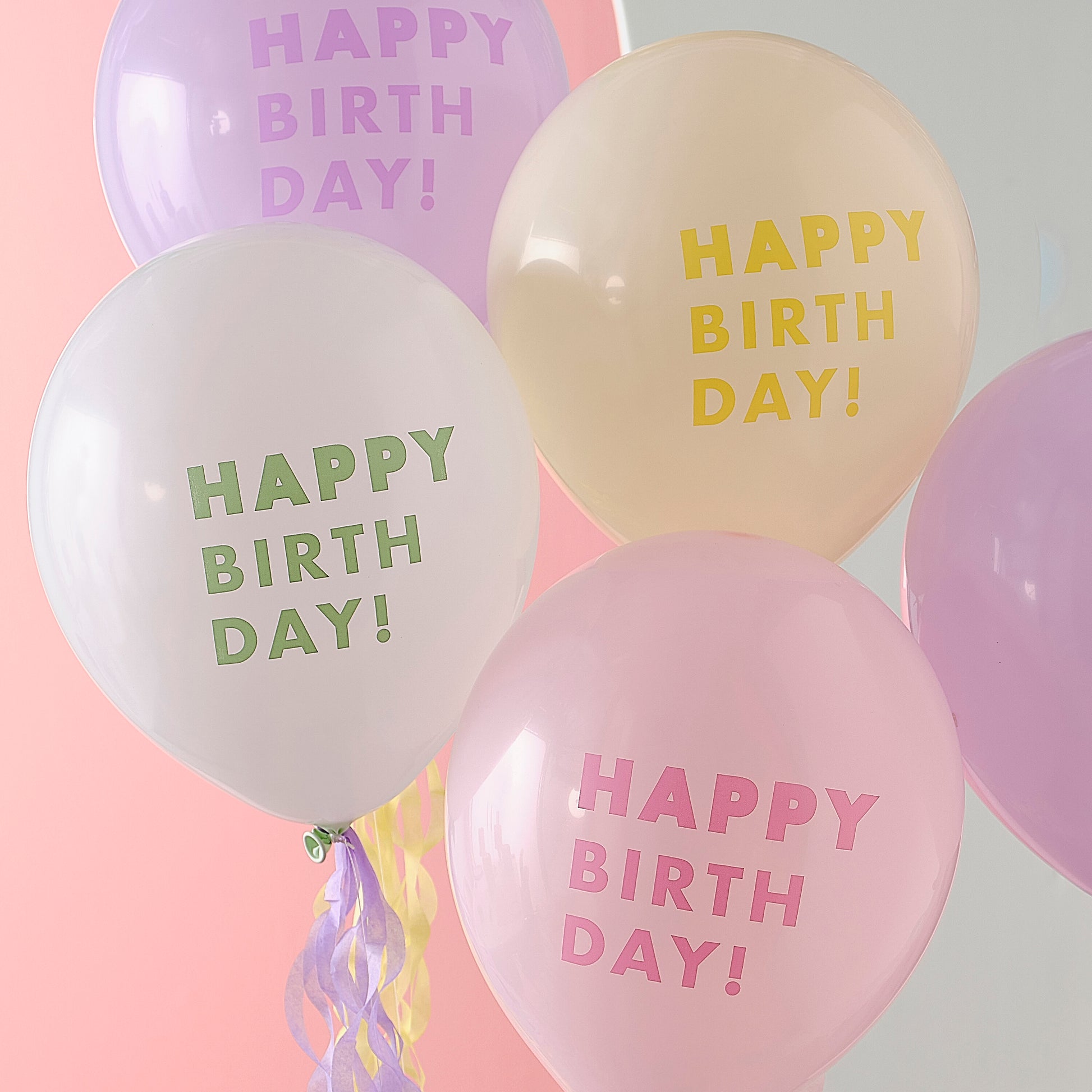 Make a statement with these fun pastel Happy Birthday Balloons with tissue paper tails. These party balloons feature a printed 'Happy Birthday' slogan.
