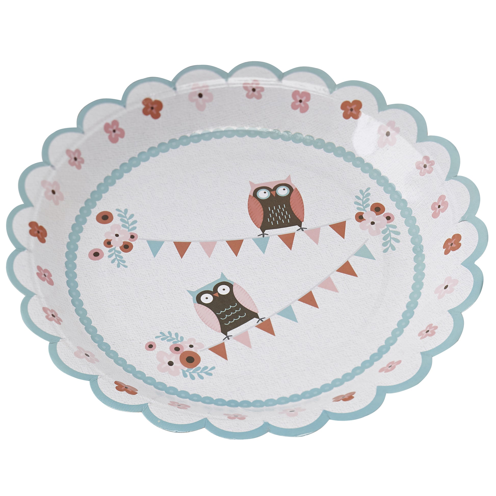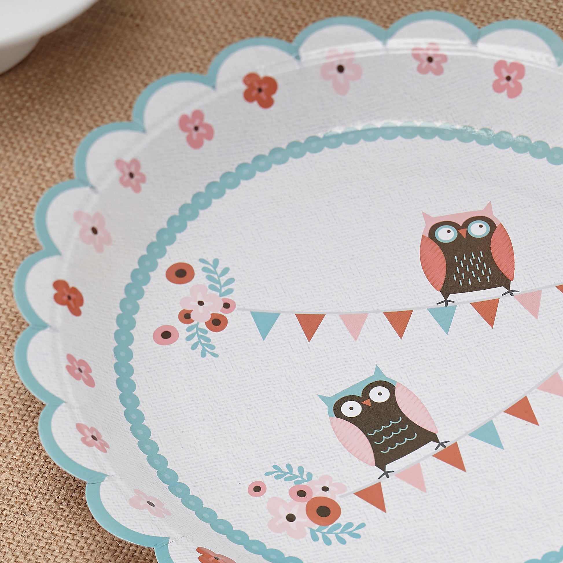 Pack of 8 frilly edged plates with our adorable patchwork owls sitting on a line of bunting with flowers. 23cm in width. Great for baby showers, first birthdays and general birthday parties.