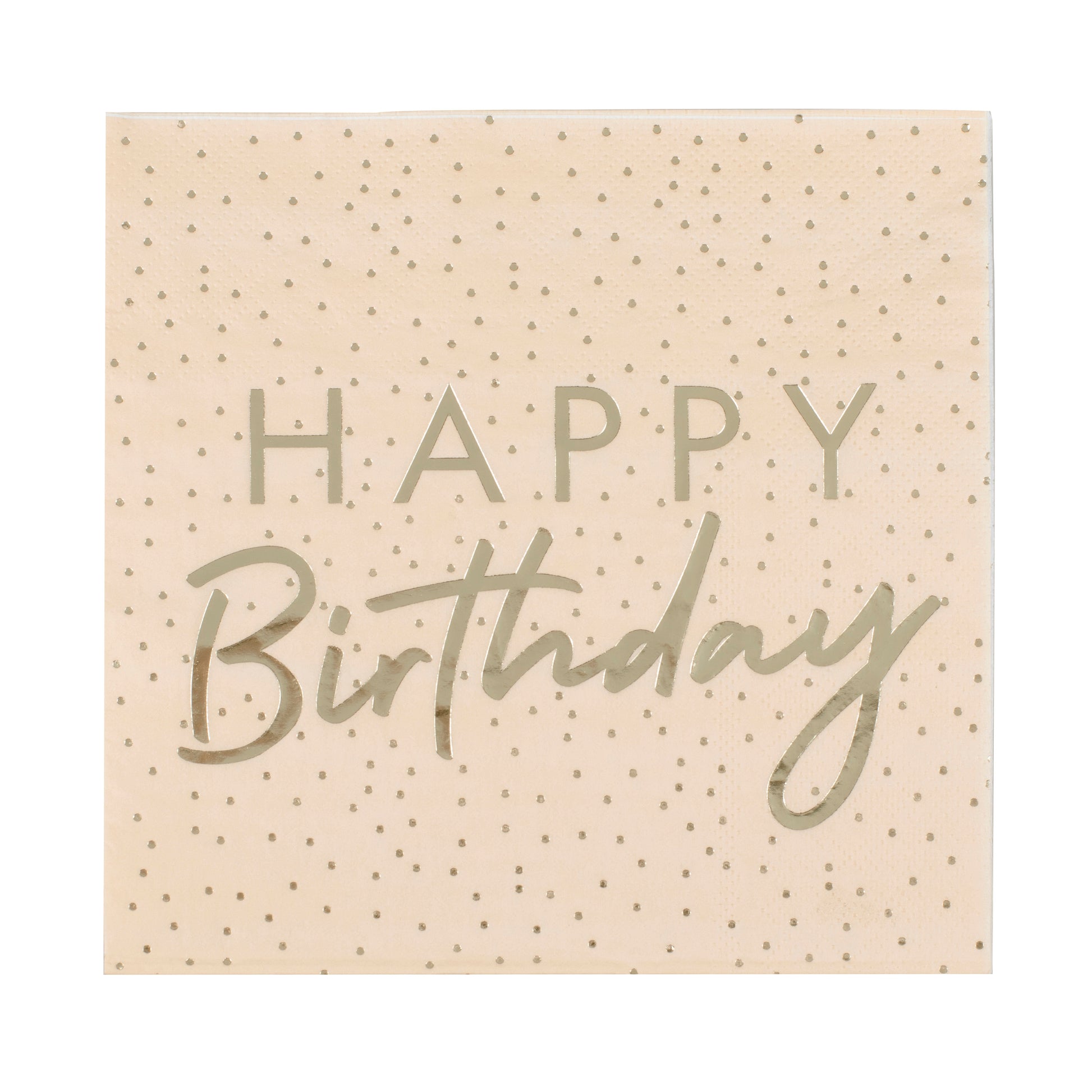 16 x Peach Gold Happy Birthday Paper Napkins, measuring 16cm (H) x 16cm (W).
