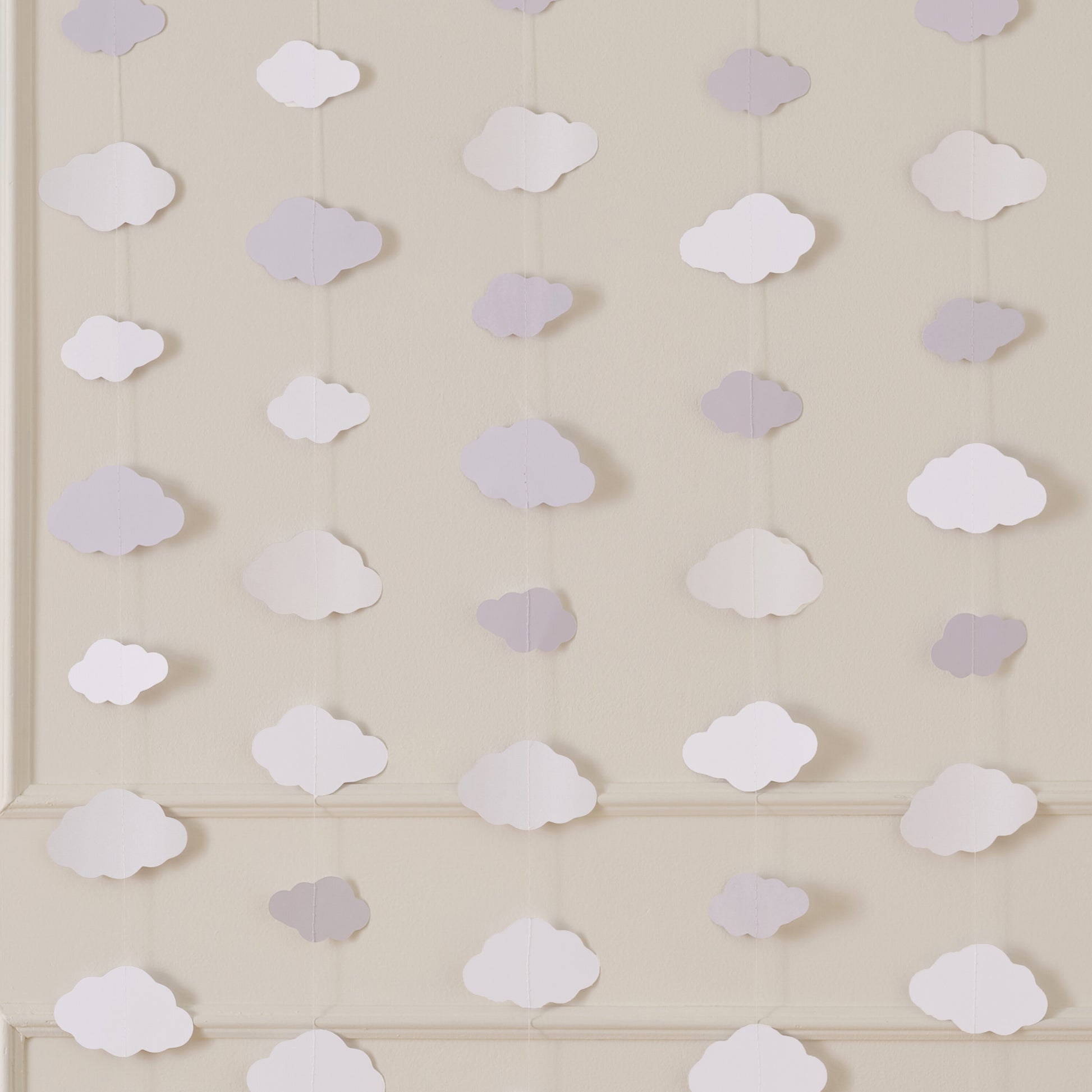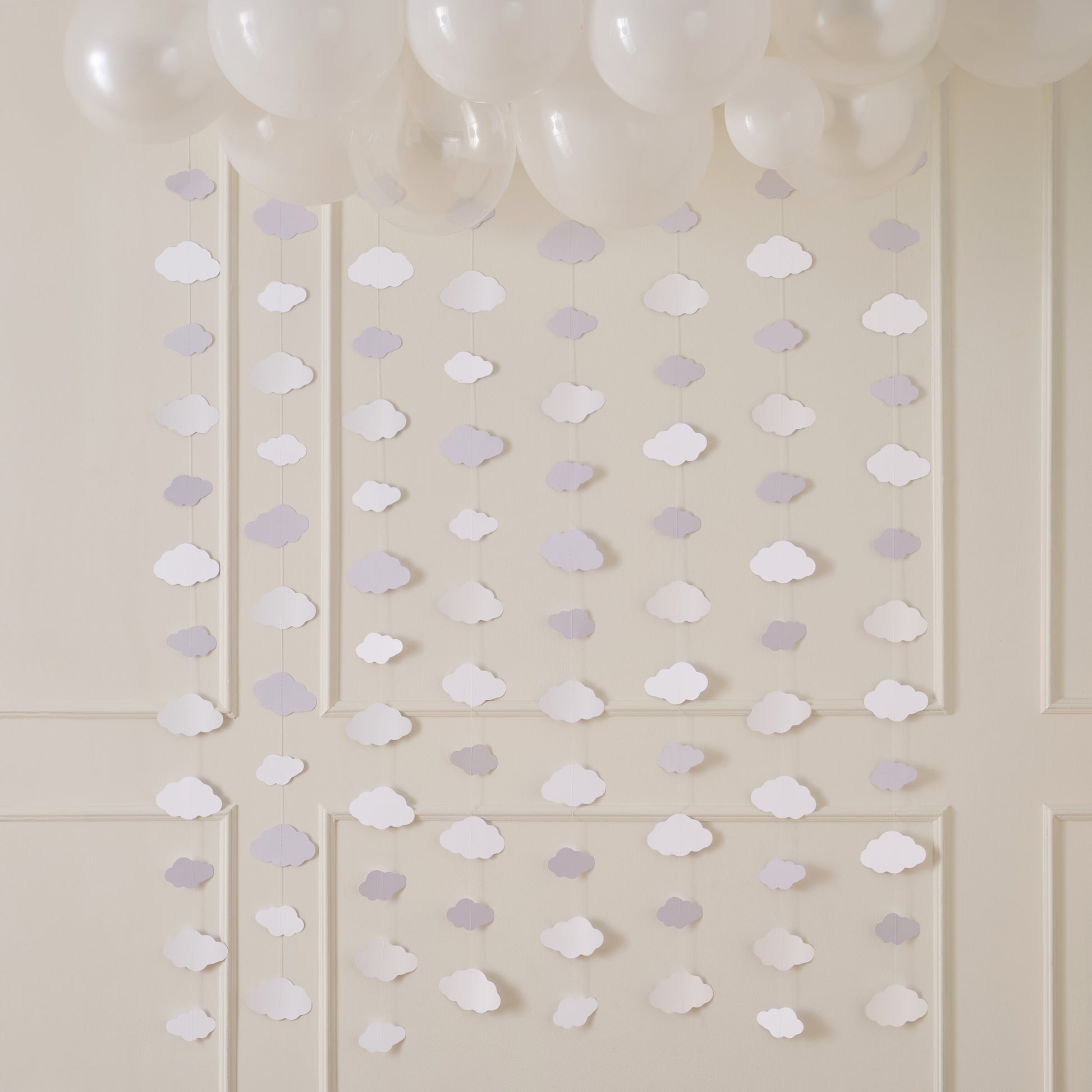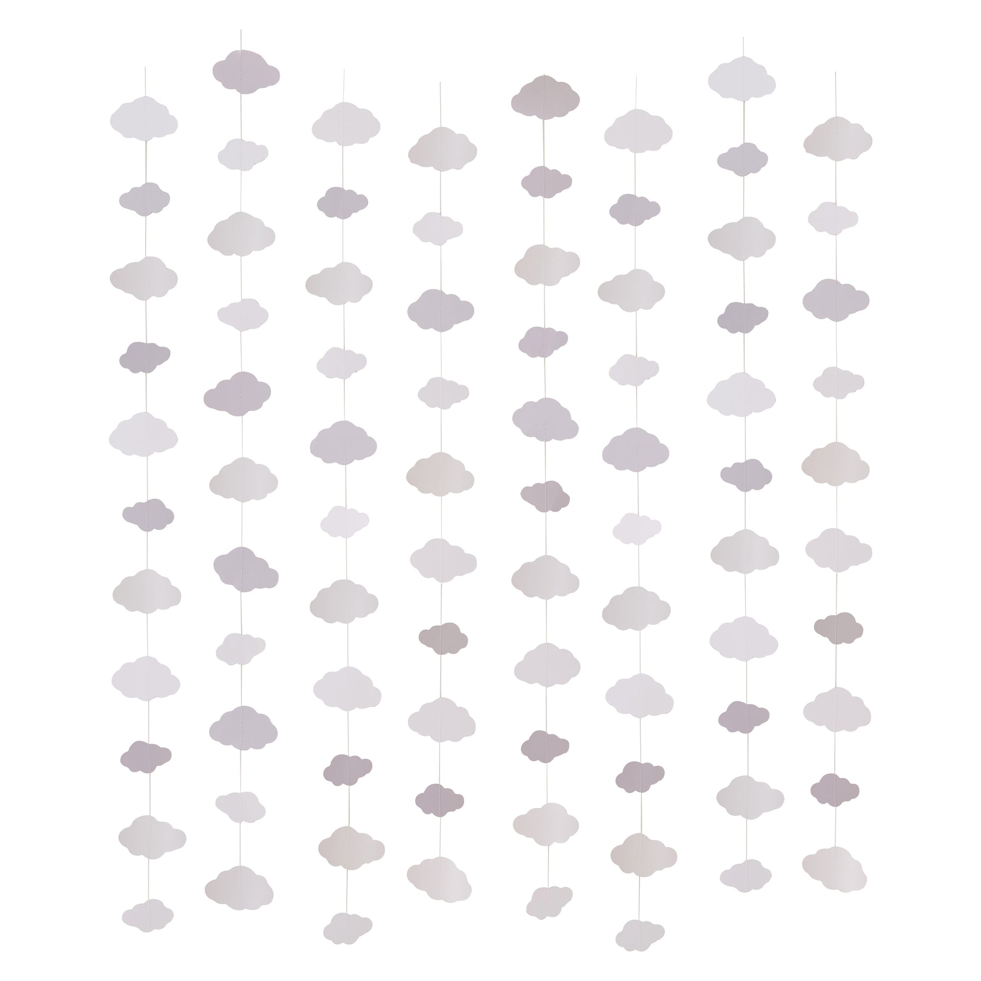8 strands of white, grey and pearlescent card clouds at 1.8m long with 1.5m white twine to hang.