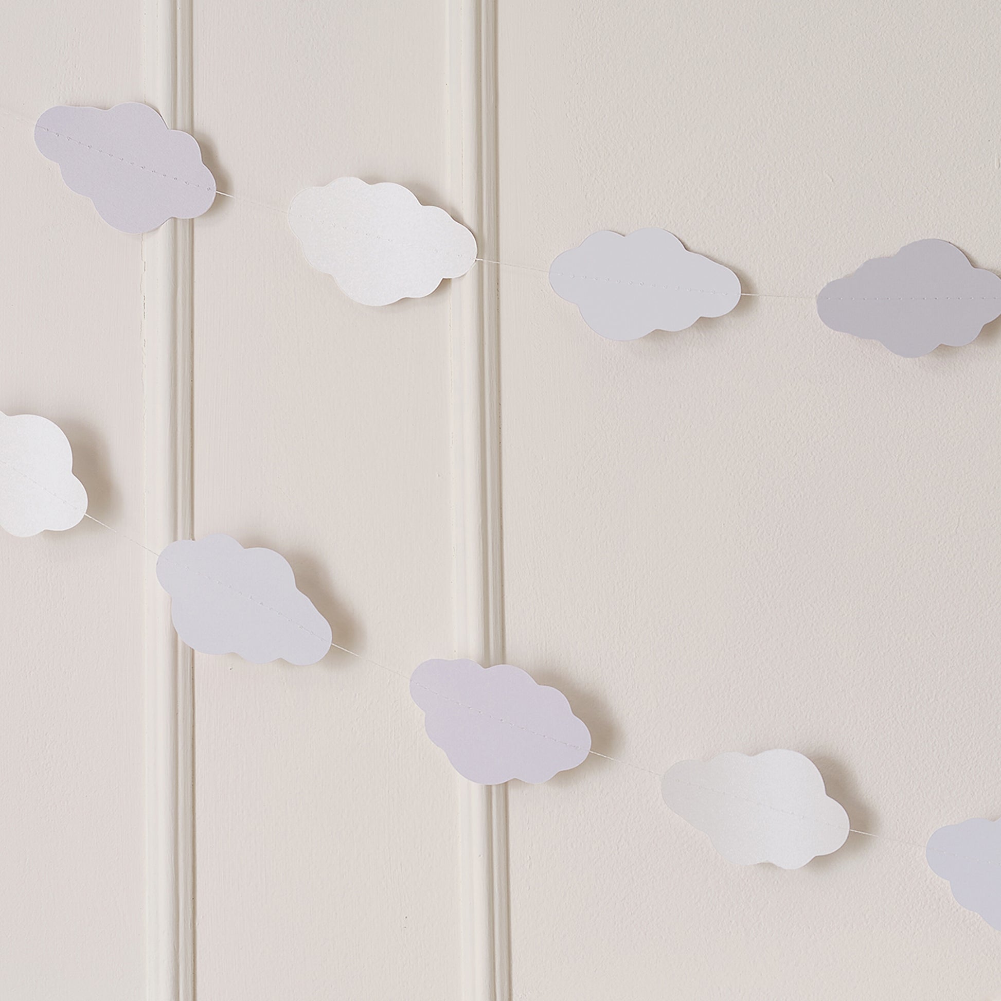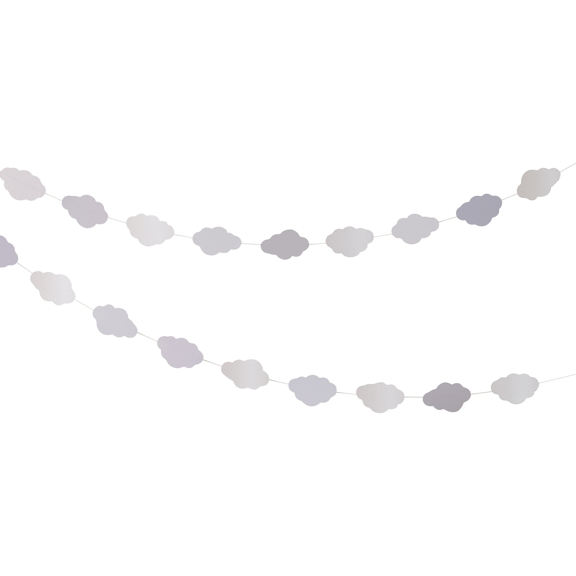 1 x white, grey and pearlescent card cloud garland at 3m long with cotton twine.