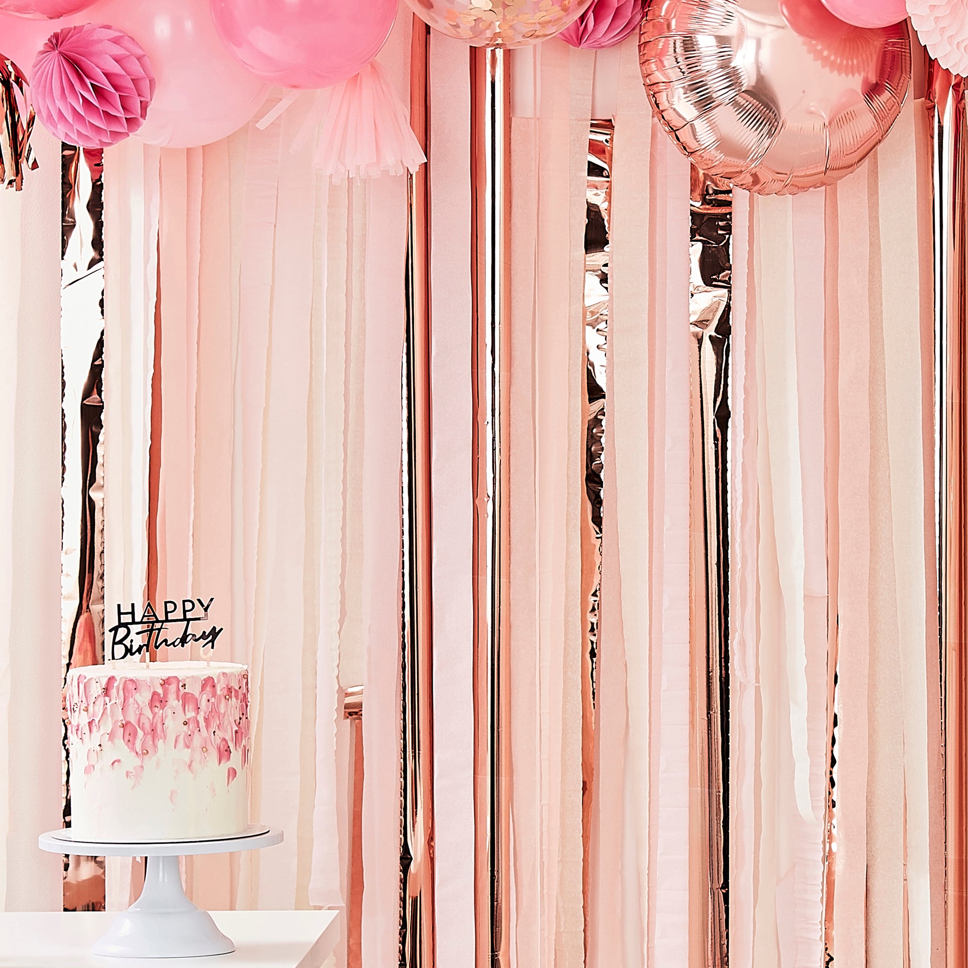 These simple rose gold streamers are a great way to create a simple party backdrop this can easily be hung from walls or furniture to create the perfect look for your party