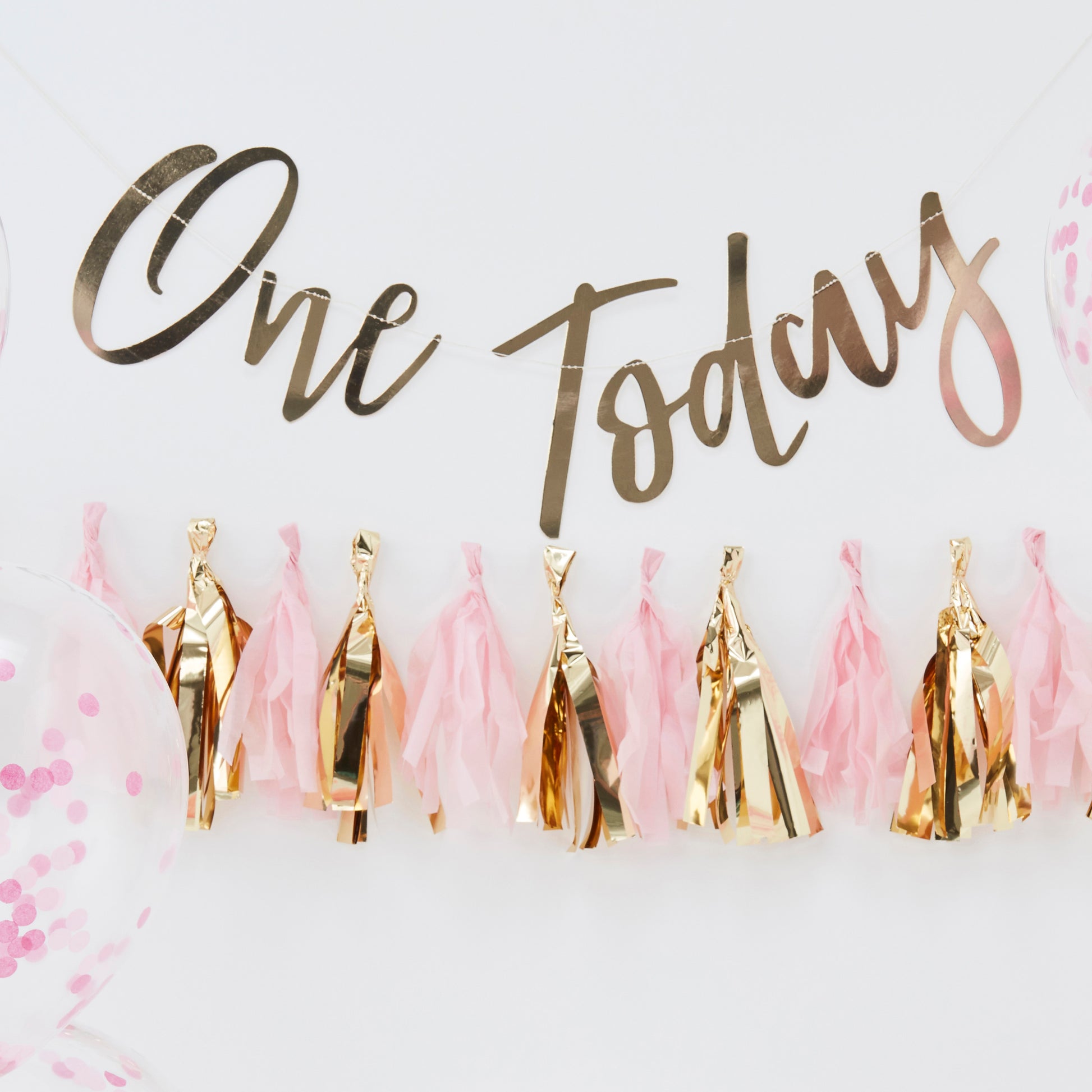 Each pack includes 5x pink confetti balloons measuring 12". 1x gold foiled party hat measuring 4cm (W) x 8.5cm (H). 1x pink and gold tassel garland (1.5M) with 16 tassels (8x gold, 8x pink). 1x 'One Today' backdrop measuring: 1.5m.