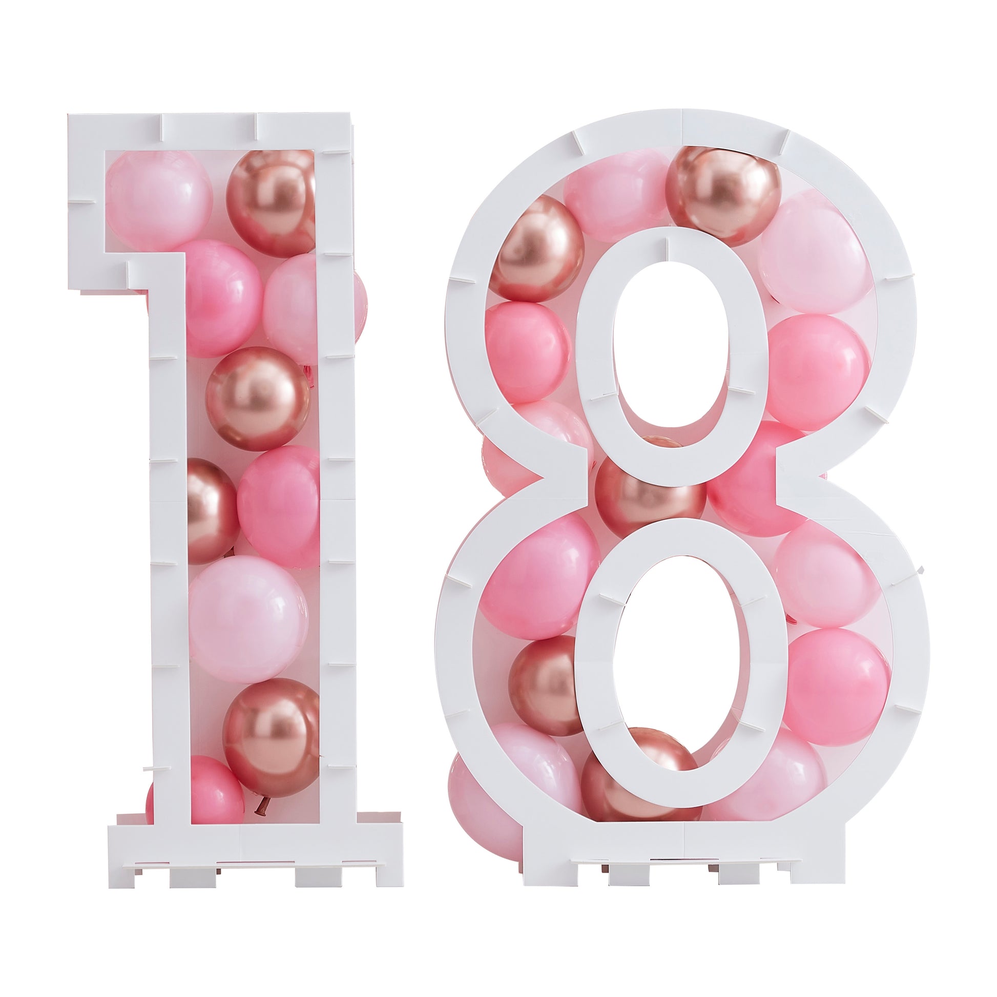 Each pack contains: 1 x Number 1 and 1 x Number 8 Balloon Stand measuring 81cm (H) 58cm (W) 14cm (D), Strong adhesive foam pads in 2 sizes and foam support holders included for easy assembly and a mixture of 40 x 5 inch pink and white balloons: