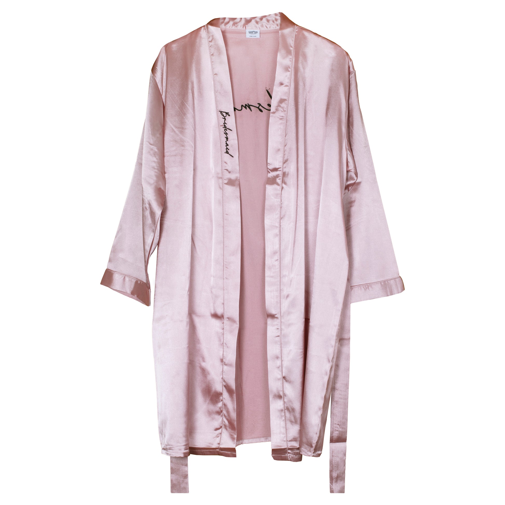 1 x Pink satin dressing gown with 'bridesmaid' embroidered in black on lapel and the back of the gown