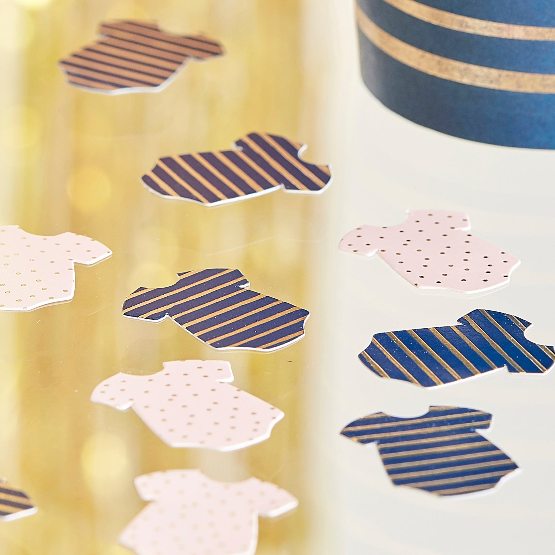 The combination of baby pink and navy blue allow for a gender neutral theme so no matter the gender, scatter this baby shower confetti on every surface!
