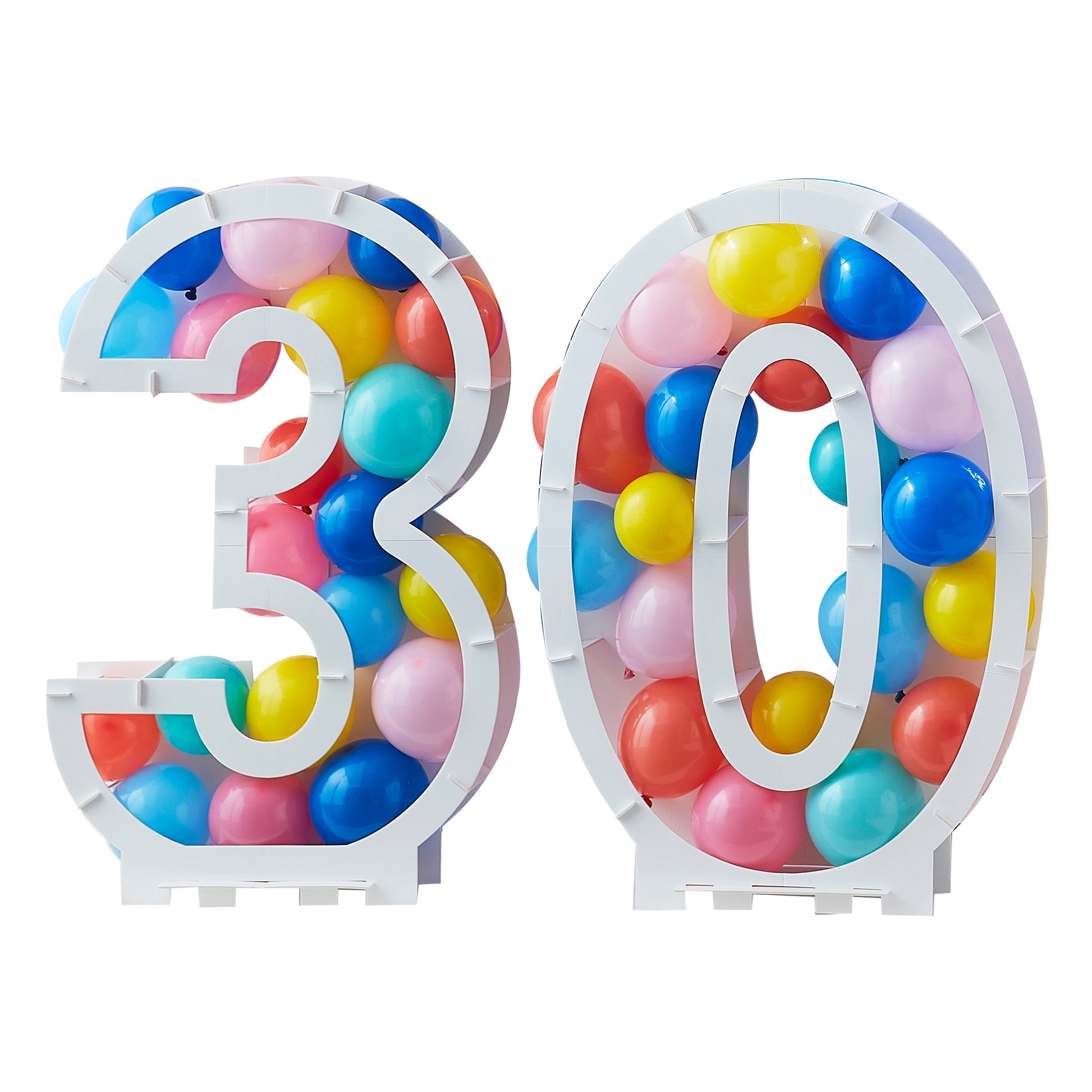 Each pack contains: 1 x Number 3 and 1 x Number 0 Balloon Stand measuring 81cm (H) 58cm (W) 14cm (D), Strong adhesive foam pads in 2 sizes and foam support holders included for easy assembly and a mixture of 40 x 5 inch rainbow balloons: