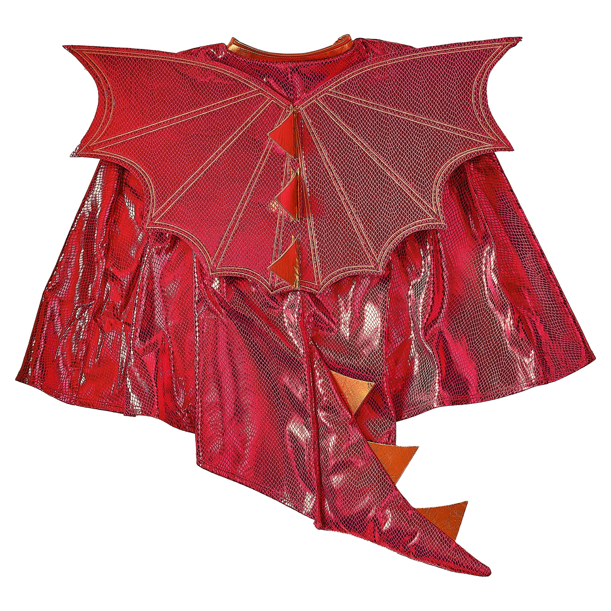This red dragon costume cape is made from red shiny scales and comes complete with wings, tail and scary spines.