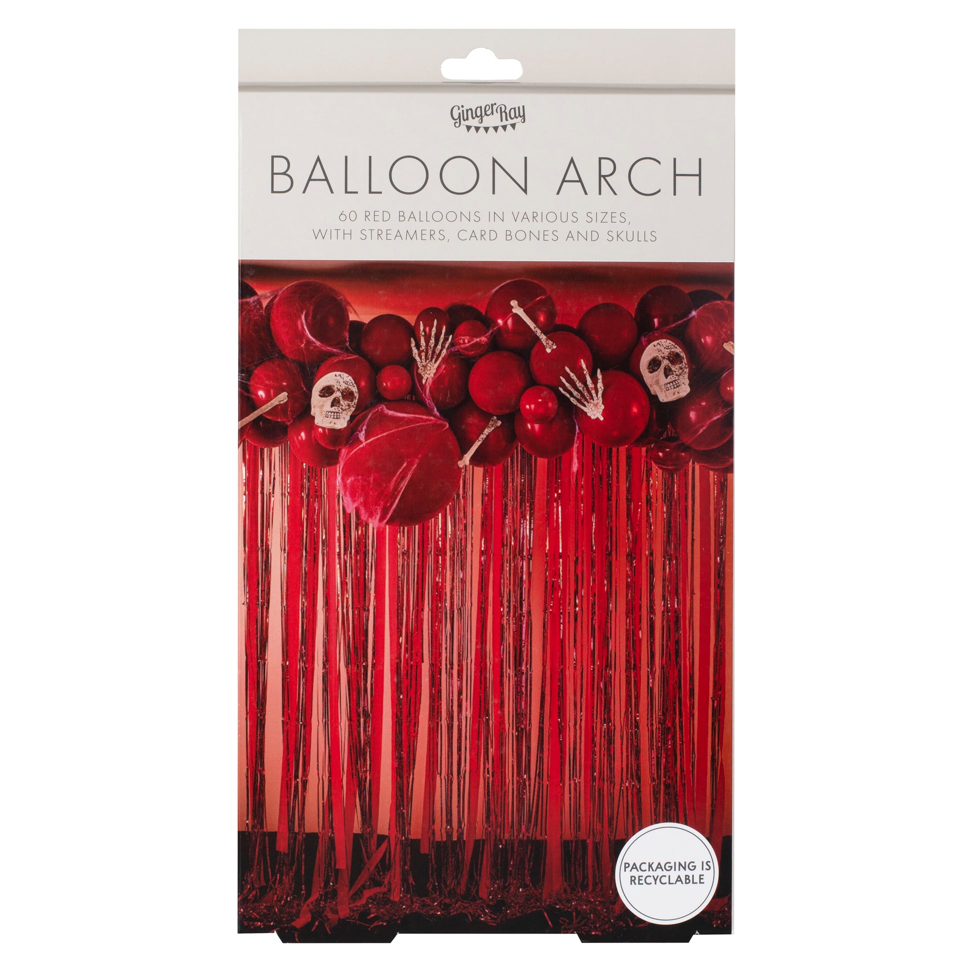 This balloon arch kit contains the accessories you need to be the scariest house on the street, including 60 red balloons with streamers, white webbing, card bones and skulls.