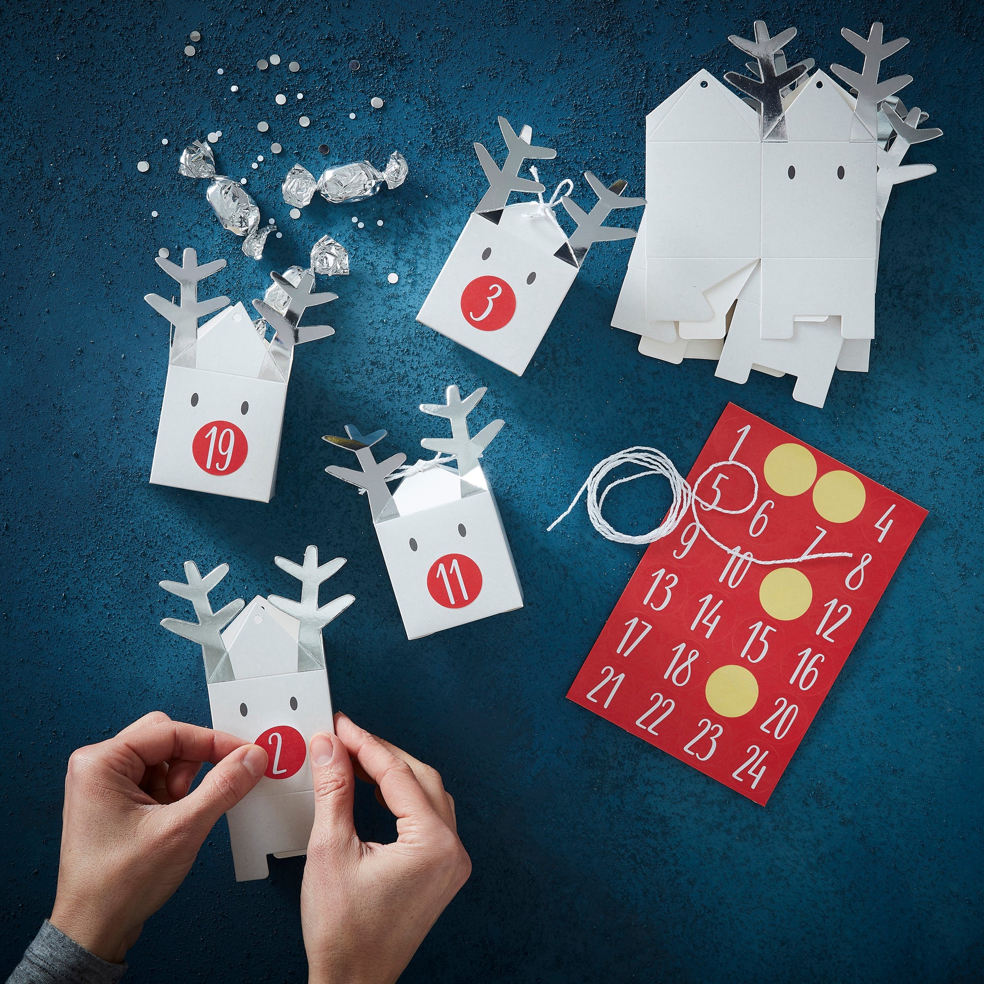 Each pack includes 24 boxes, 24 silver and white twine, 1 x sticker sheet. Boxes measure:12cm (H) x 6cm(W) with antlers and 6 x 6cm without the antlers.