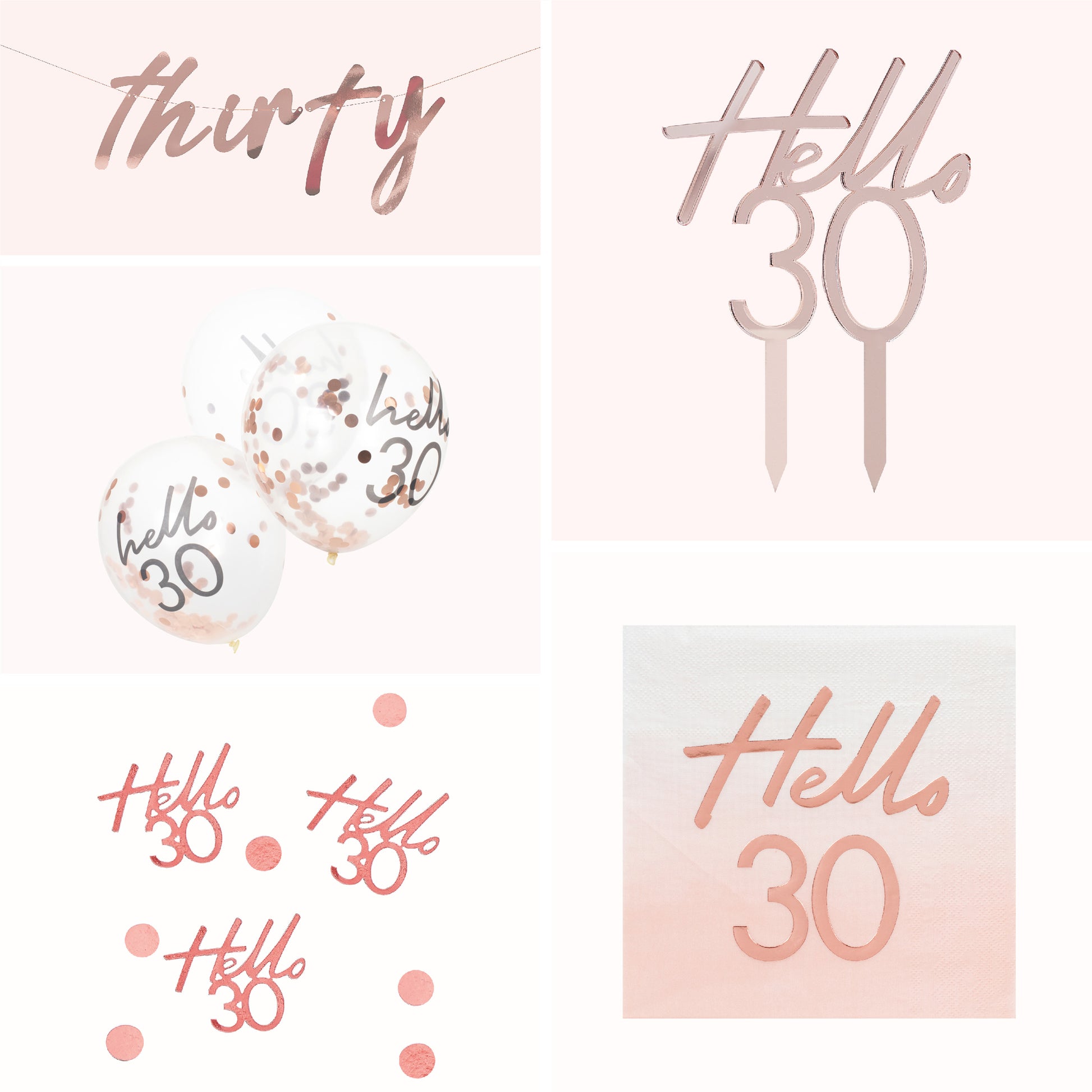 Perfect to create a shimmering rose gold party, our gorgeous rose gold 30th birthday decorations will add the ultimate shine to the occasion. With Confetti balloons and bunting to help to create your party backdrop, and confetti to decorate your tables or serving station. Then our Hello 30 cake topper will add the perfect finishing touch to the cake! These rose gold 30th birthday decorations will be perfect to make someone feel extra special on their big birthday.