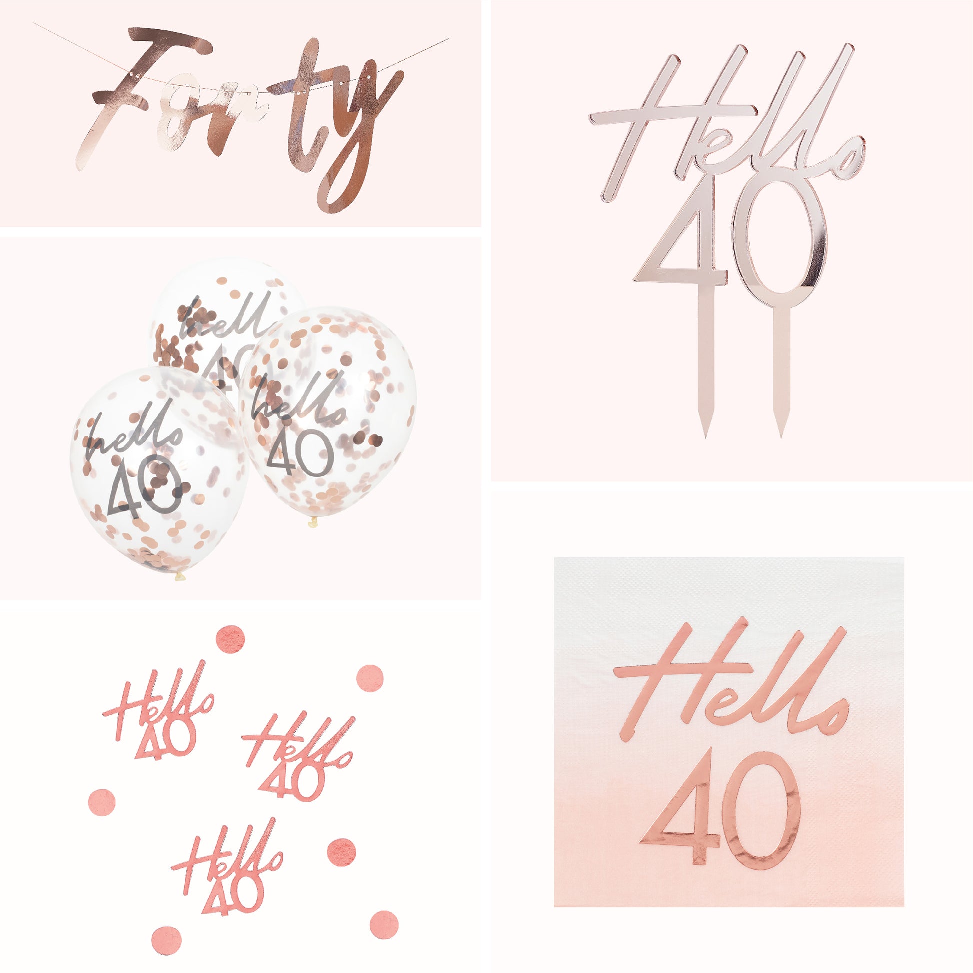 Perfect to create a shimmering rose gold party, our gorgeous rose gold 40th birthday decorations will add the ultimate shine to the occasion. With Confetti balloons and bunting to help to create your party backdrop, and confetti to decorate your tables or serving station. Then our Hello 40 cake topper will add the perfect finishing touch to the cake, and napkins to serve will finish the theme off! These rose gold 40th birthday decorations will be perfect to make someone feel extra special on their big birthday.