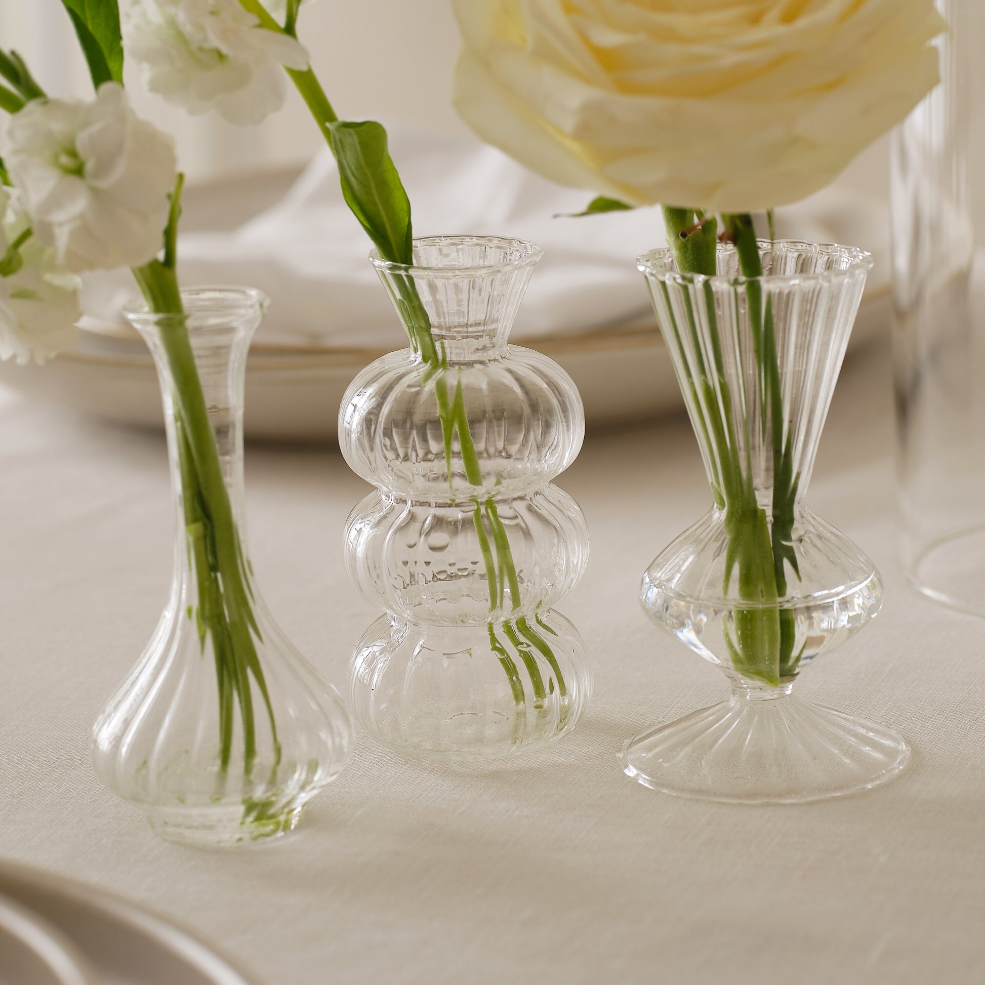 3 x glass bud vases at 10cm and 6cm by 5cm wide.