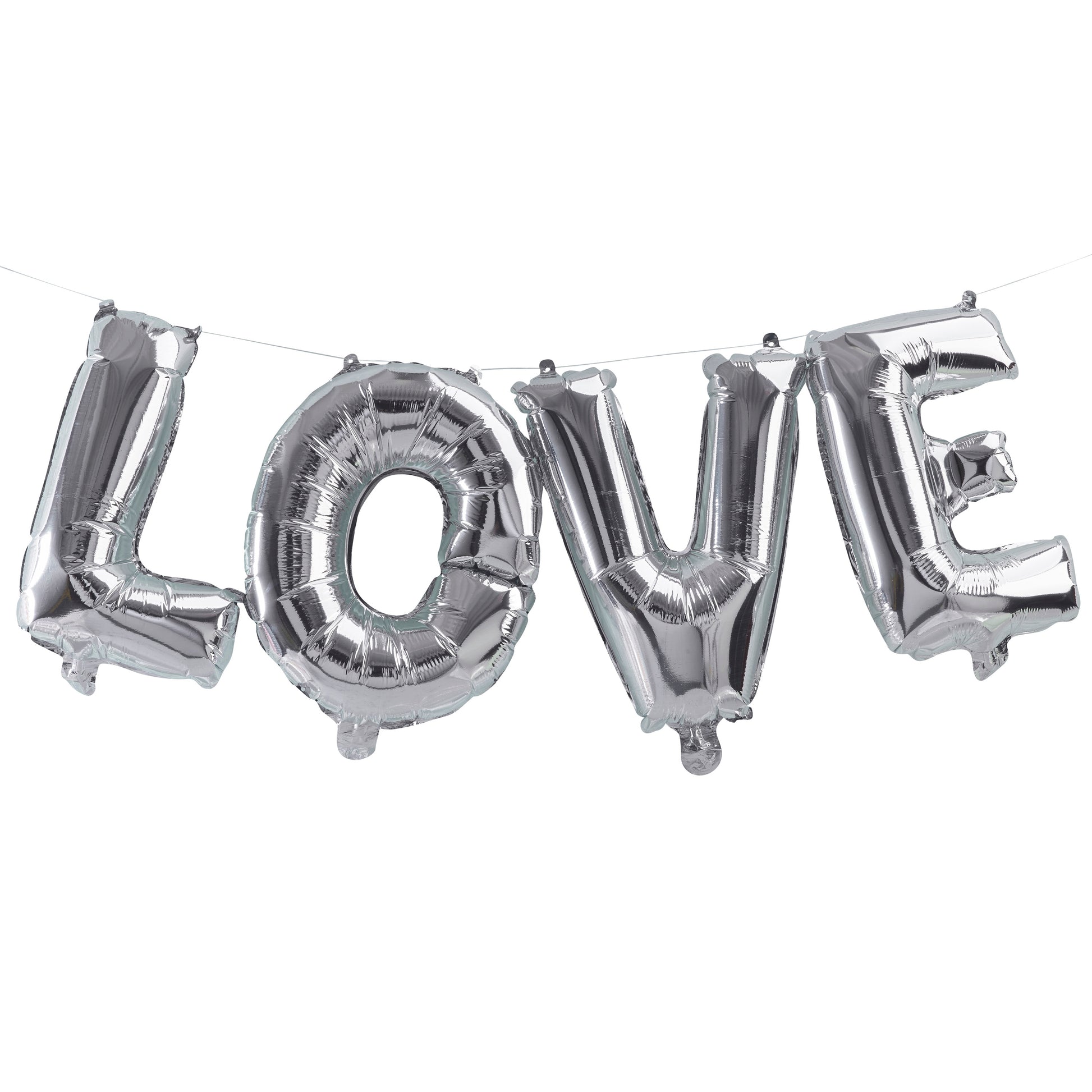 Each pack contains 4x 12" foiled balloons spelling LOVE, 1x clear straw to inflate and 2.5m of clear twine.