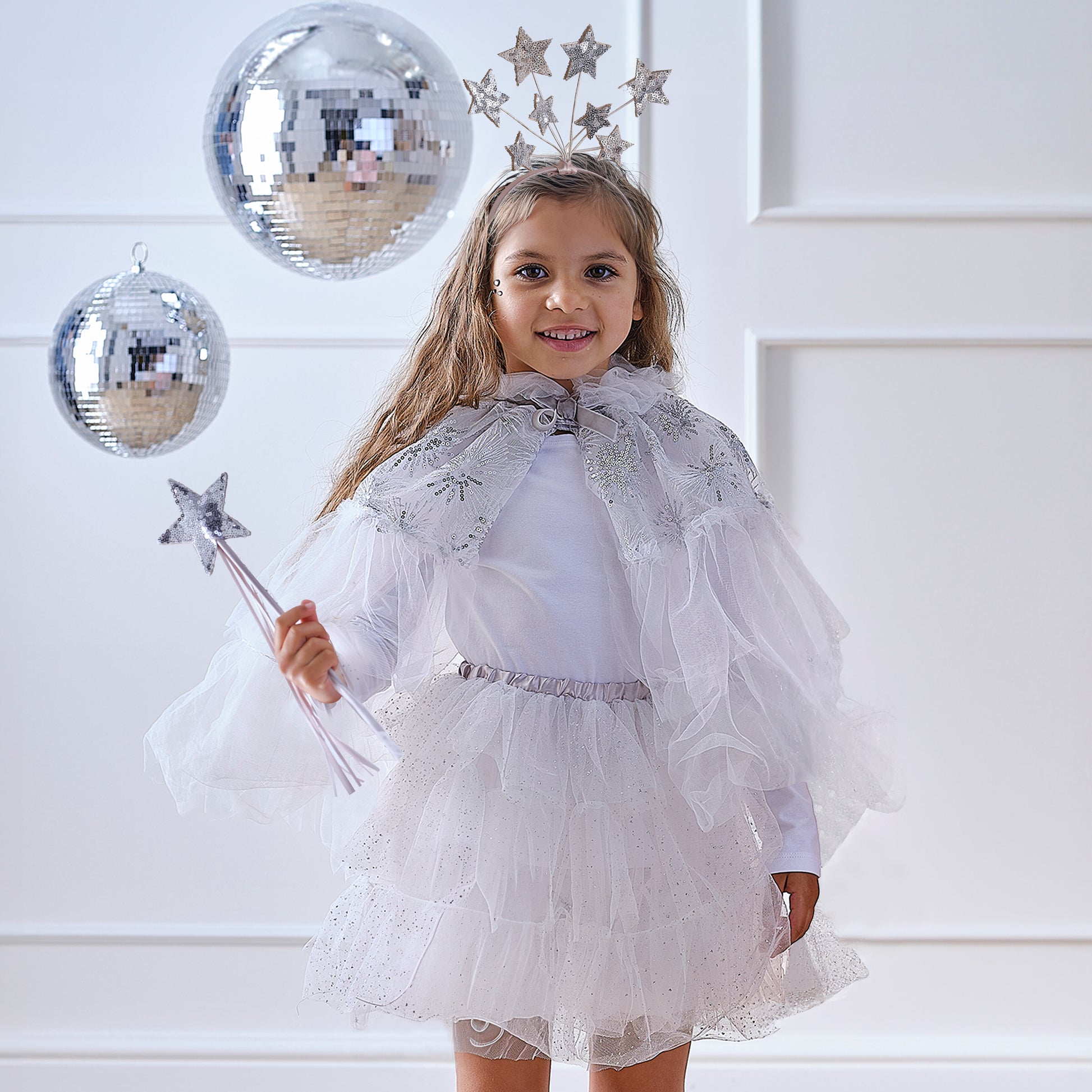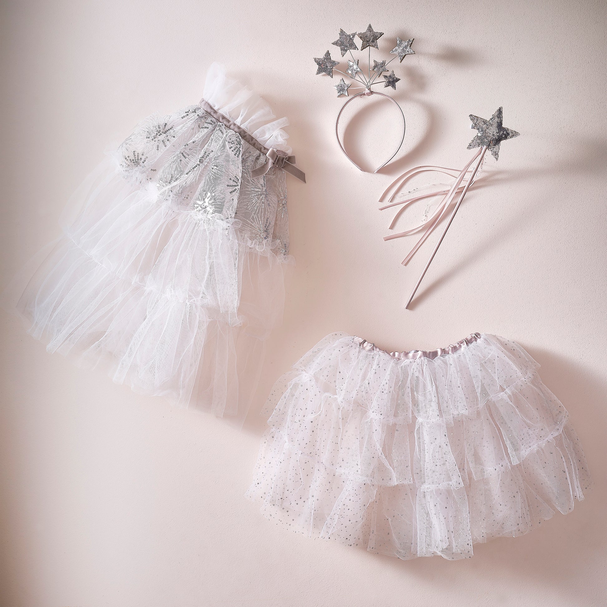Each kit contains 1 x white and silver cape, 1 x white and silver tutu, 1 x Pink and silver star headband and 1 x pink a silver star wand, to create a stunning fairy princess costume.