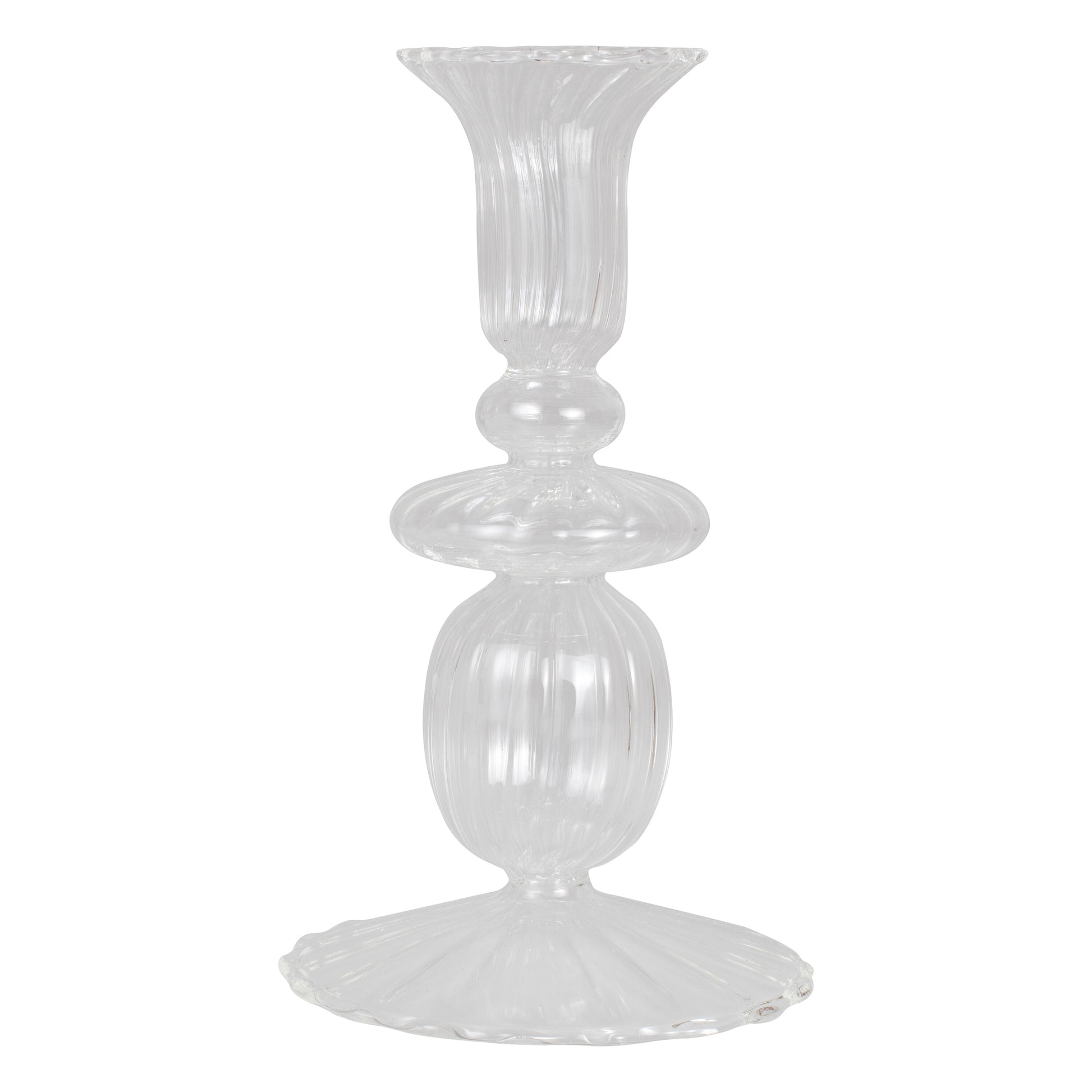 1 x small clear glass candle holder at 16.5cm tall by 9cm wide to fit a 2.2cm dinner candle.
