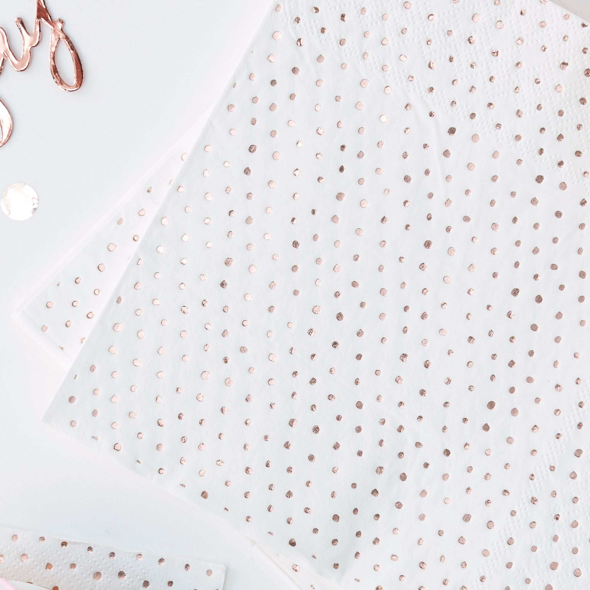 Our lovely spotty rose gold napkins shine brightly with the gorgeous rose gold foiling! Perfect for serving tasty treats at your party with these pretty napkins.