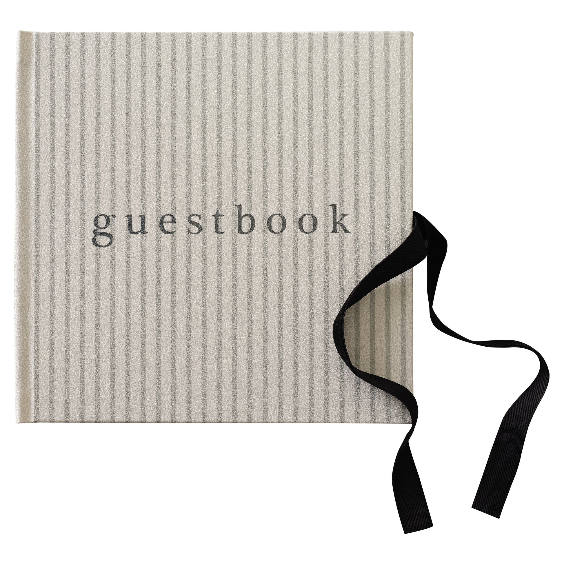 1 x white and grey striped linen look wedding guest book with 32 pages at 21.5cm H x 21.5cm W and black ribbon tie
