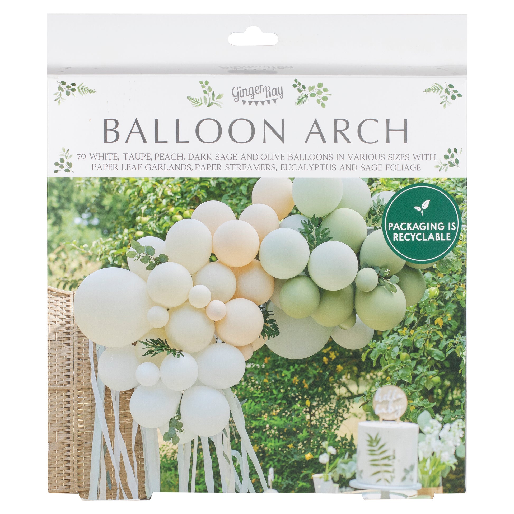 Make a statement at your event with this stunning botanical balloon arch. With balloons in a mixture of white, taupe, peach, dark sage and olive, plus paper leaf garlands, paper streamers, and eucalyptus and sage foliage, this balloon arch has everything you need to wow your guests.