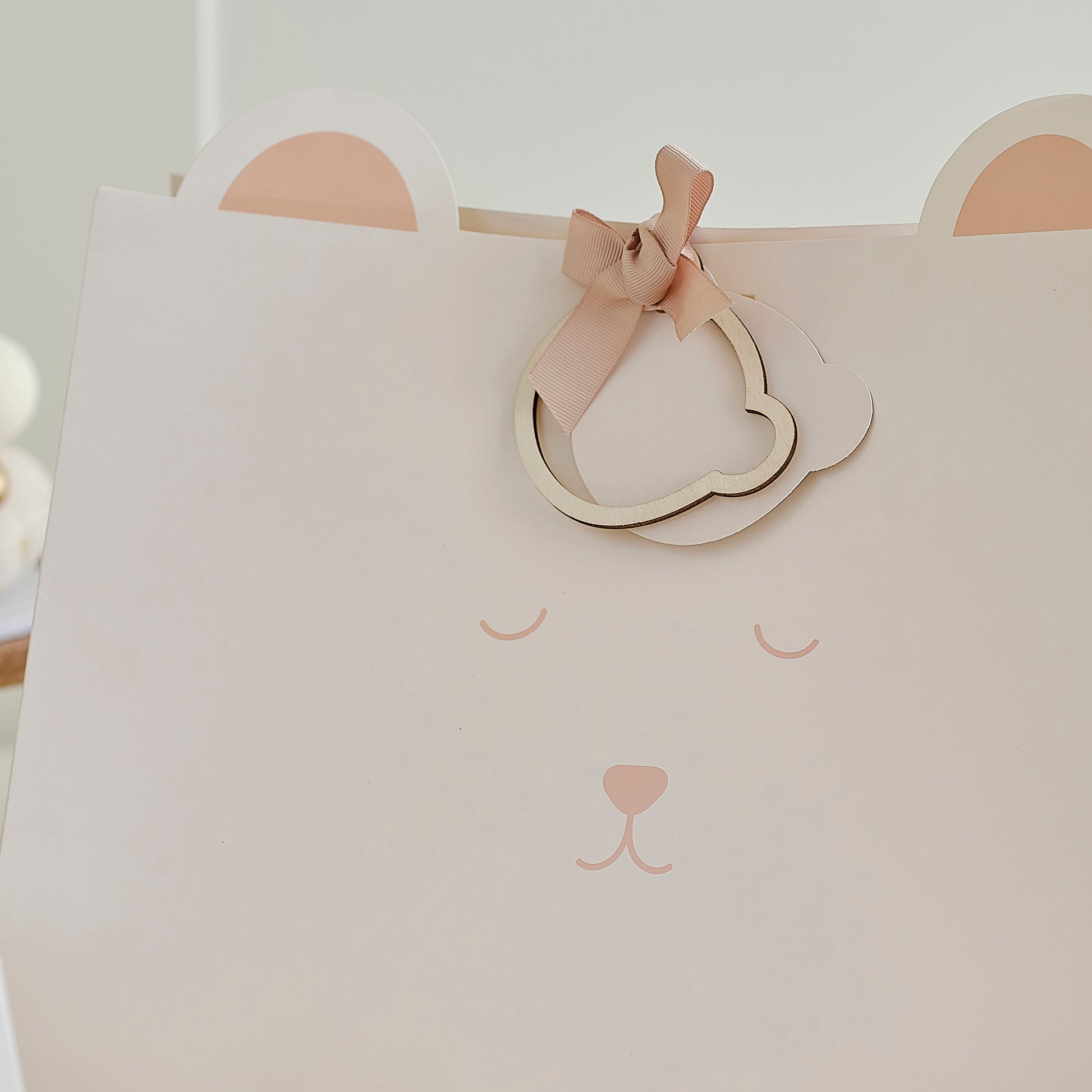 1 x Sleepy teddy baby shower gift bag with gift tag, wooden bear head tag and off-white grosgrain ribbon to tie