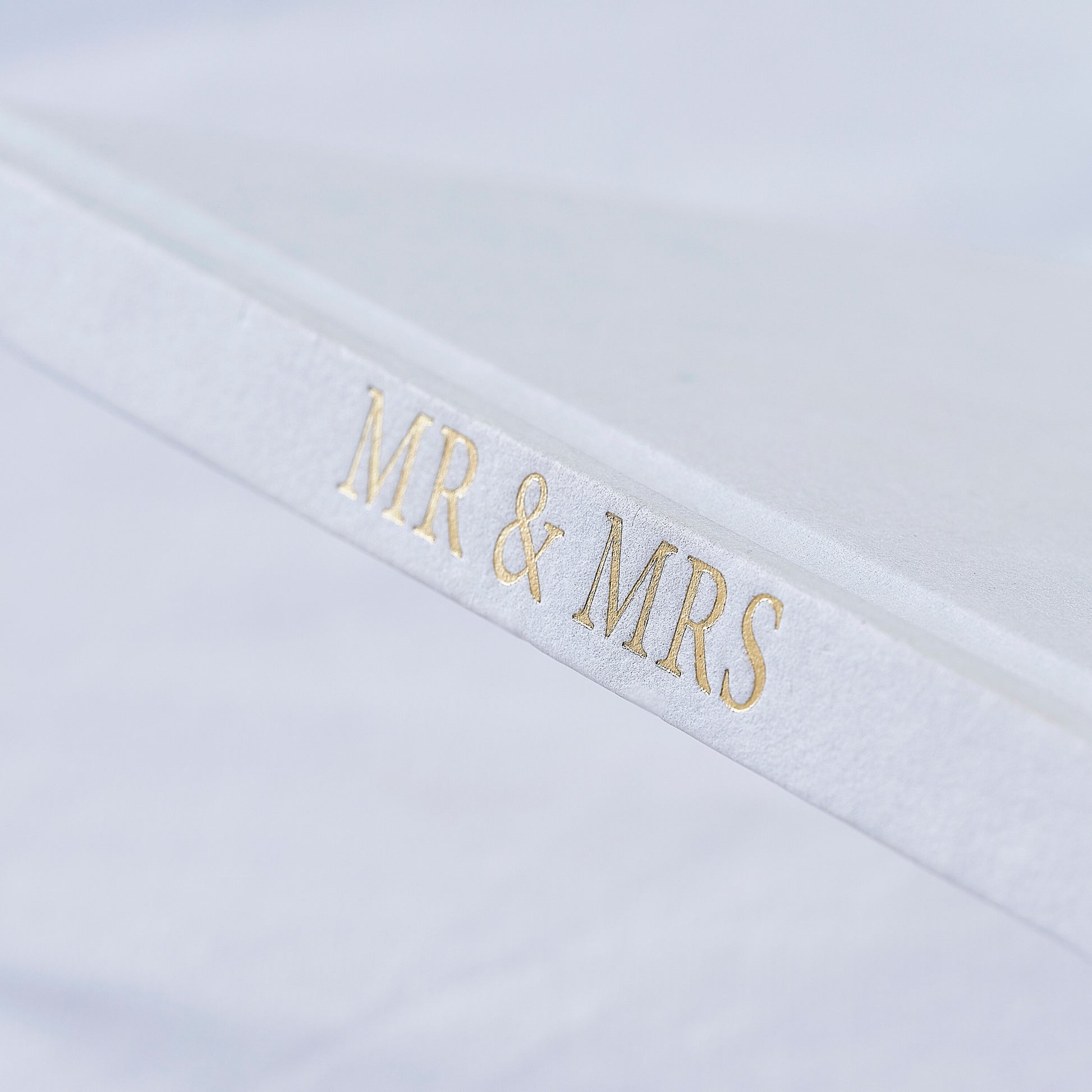 With 'Guestbook' embossed on the front, 'Mr & Mrs' in gold on the spine, gold-edged pages and a white ribbon bookmark, this wedding guest book adds a luxurious touch to any modern wedding.