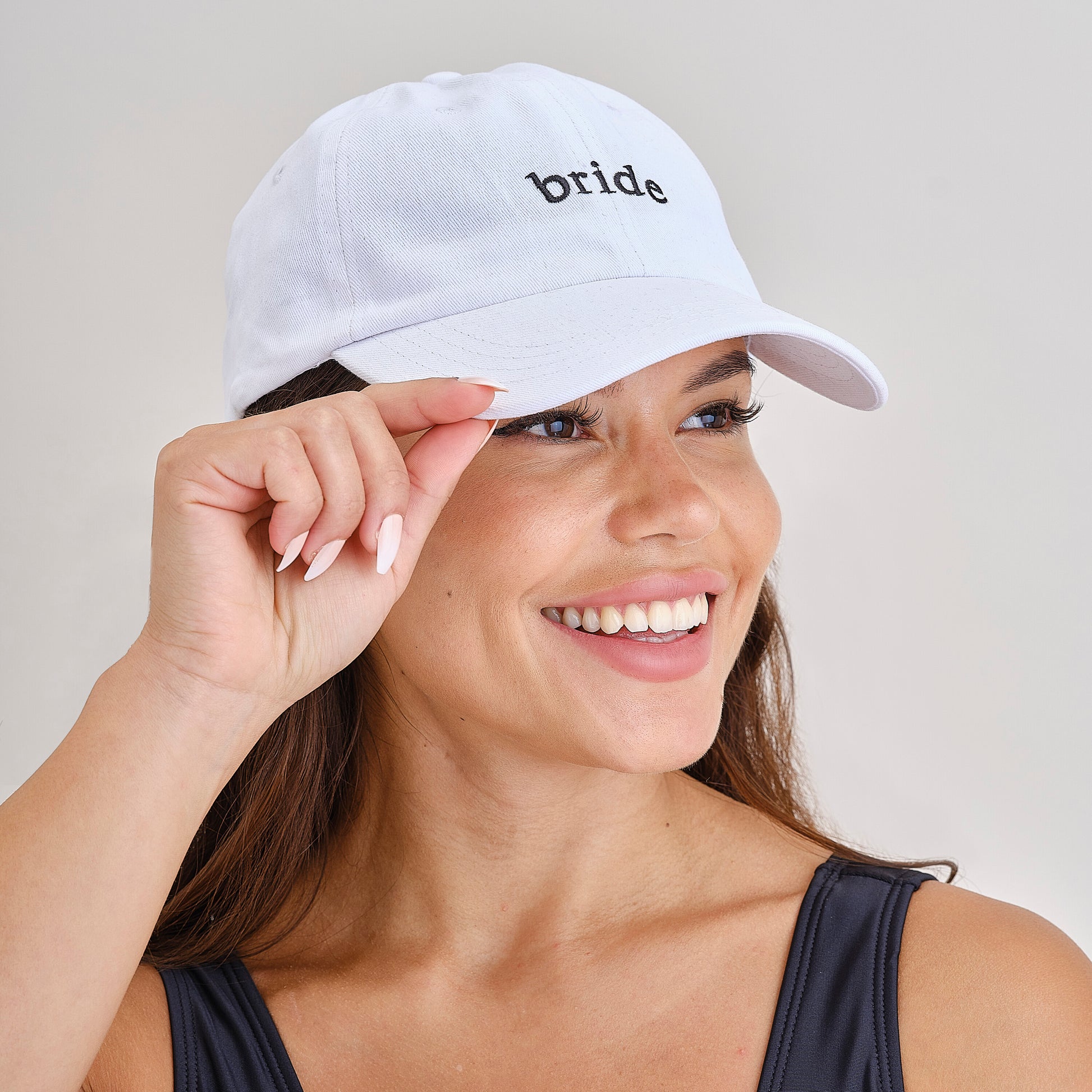 1 x White bride cap with 'bride' embroidered in black on the front, cap measures 58cm x 18cm.