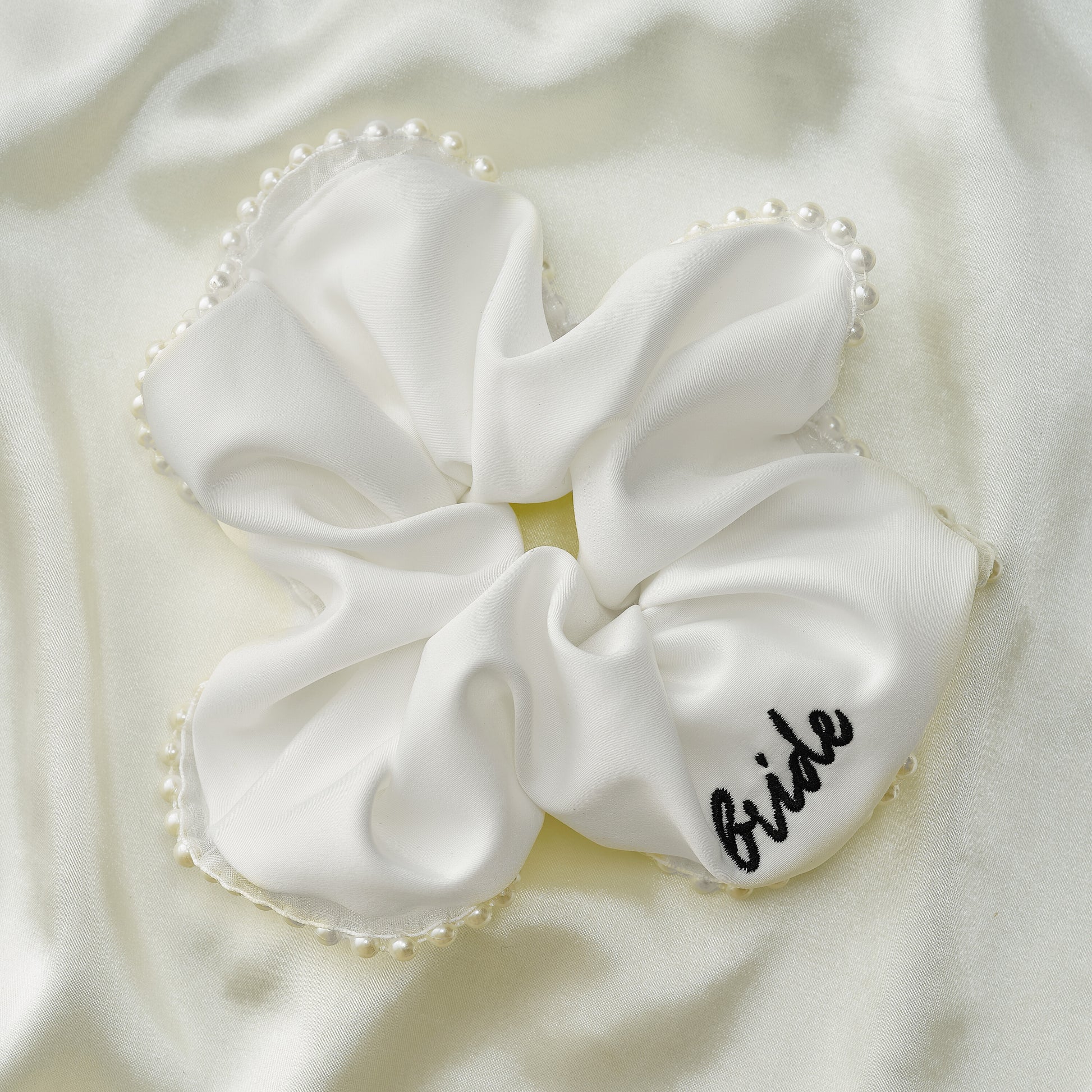 1 x "Bride" white satin scrunchie finished with a pearl edging at 13cm.
