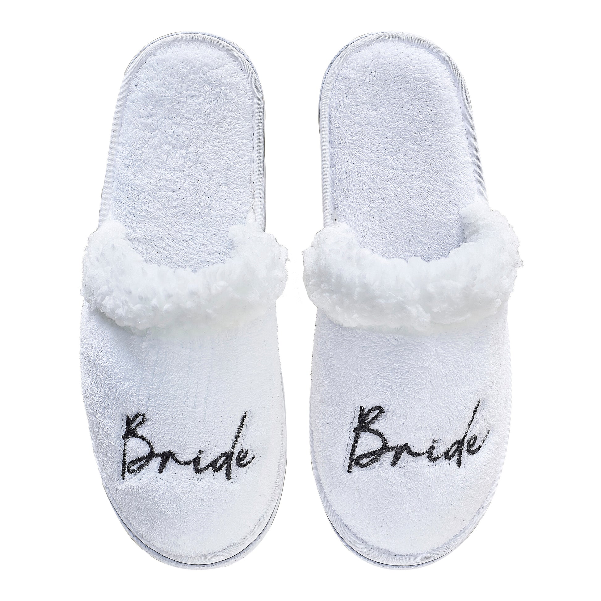 1 x Pair of white fluffy slippers, with 'Bride' embroidered in black.