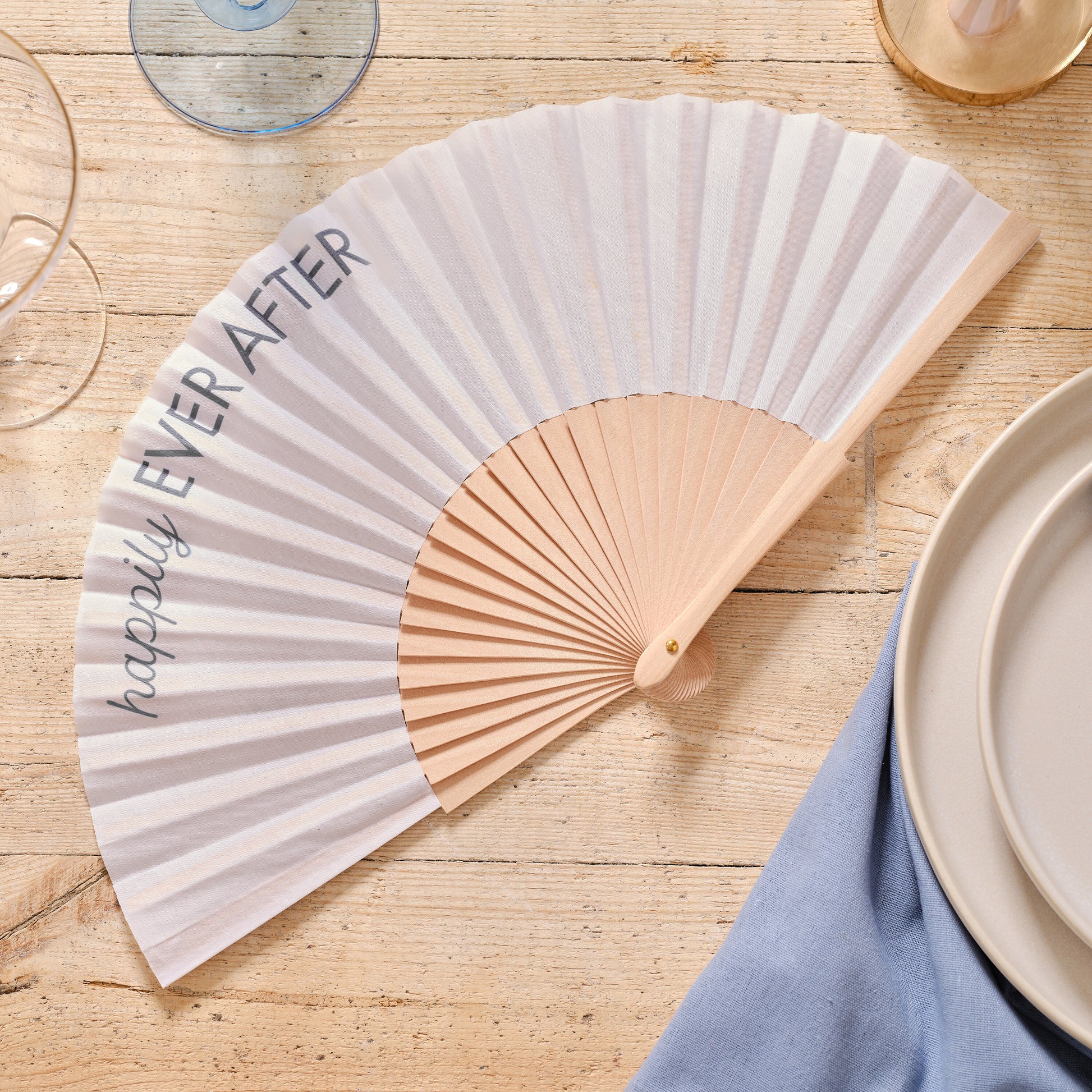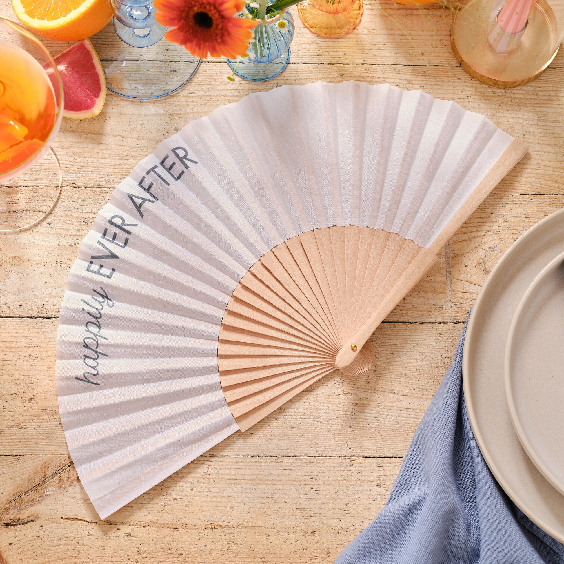 Cool off in style with these hand-held paper fans, featuring "Happily Ever After" in chic charcoal text. Perfect for adding a fun and personal touch to your wedding, these fans bring a relaxed vibe while keeping everyone feeling fresh and looking cute. A must-have accessory for your special day! They also make a lovely wedding favour that guests can treasure.