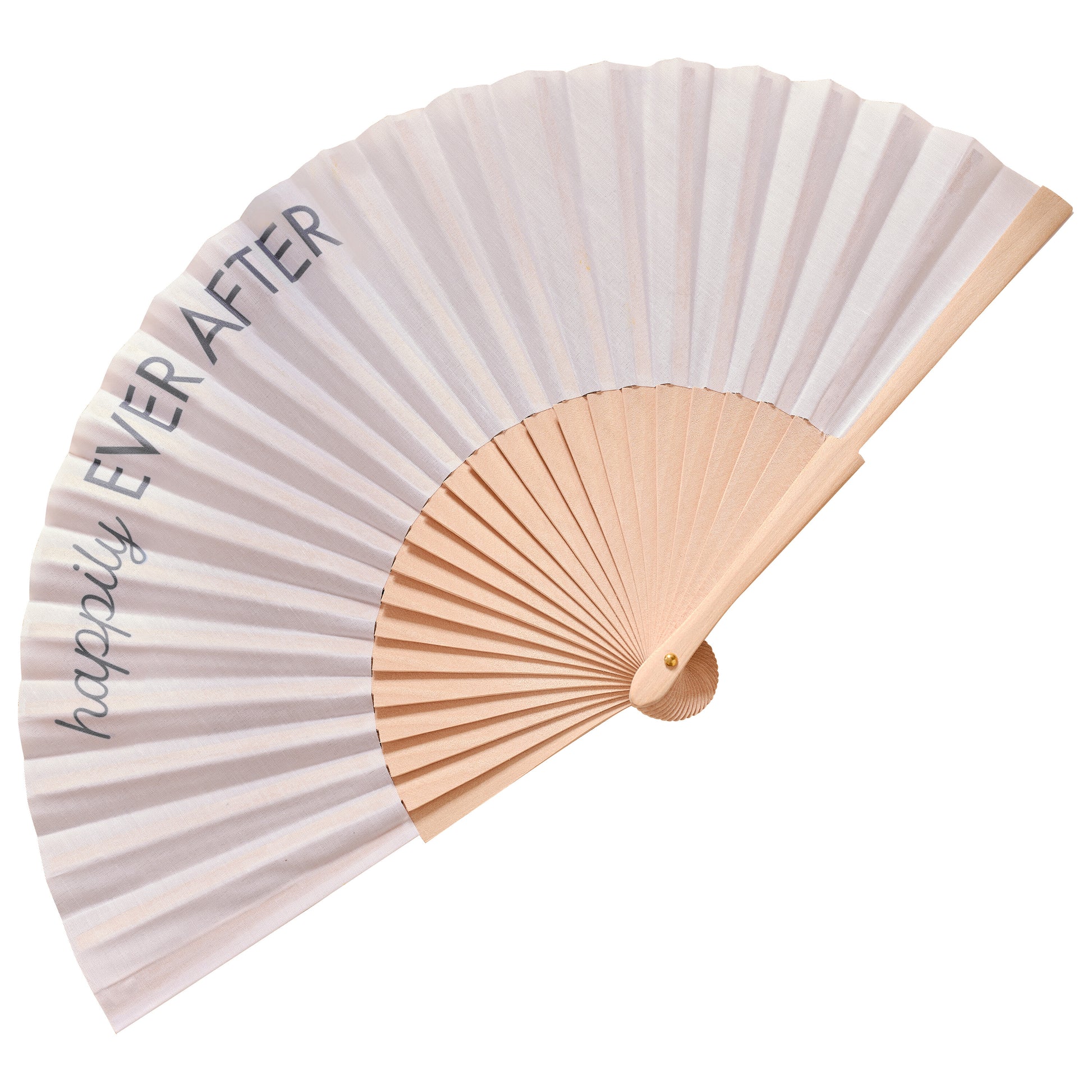 5 x white paper wedding fans at 42cm W with grey 'happily ever after' text