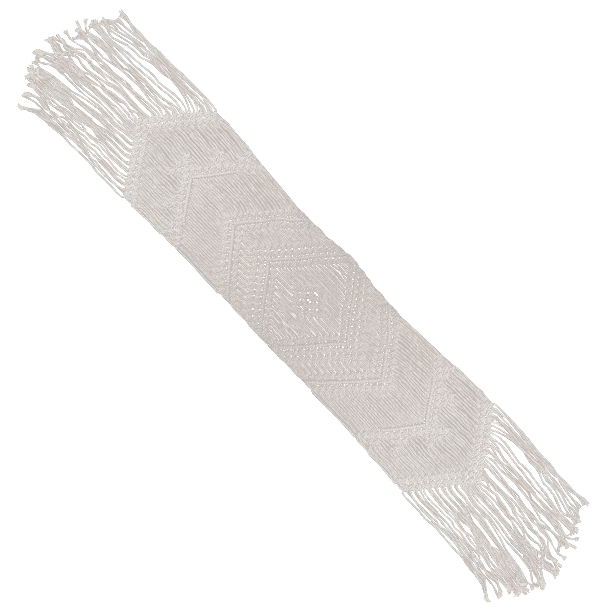 1 x white cotton Macrame Table Runner, measuring 200cm (L) x 30cm (W).