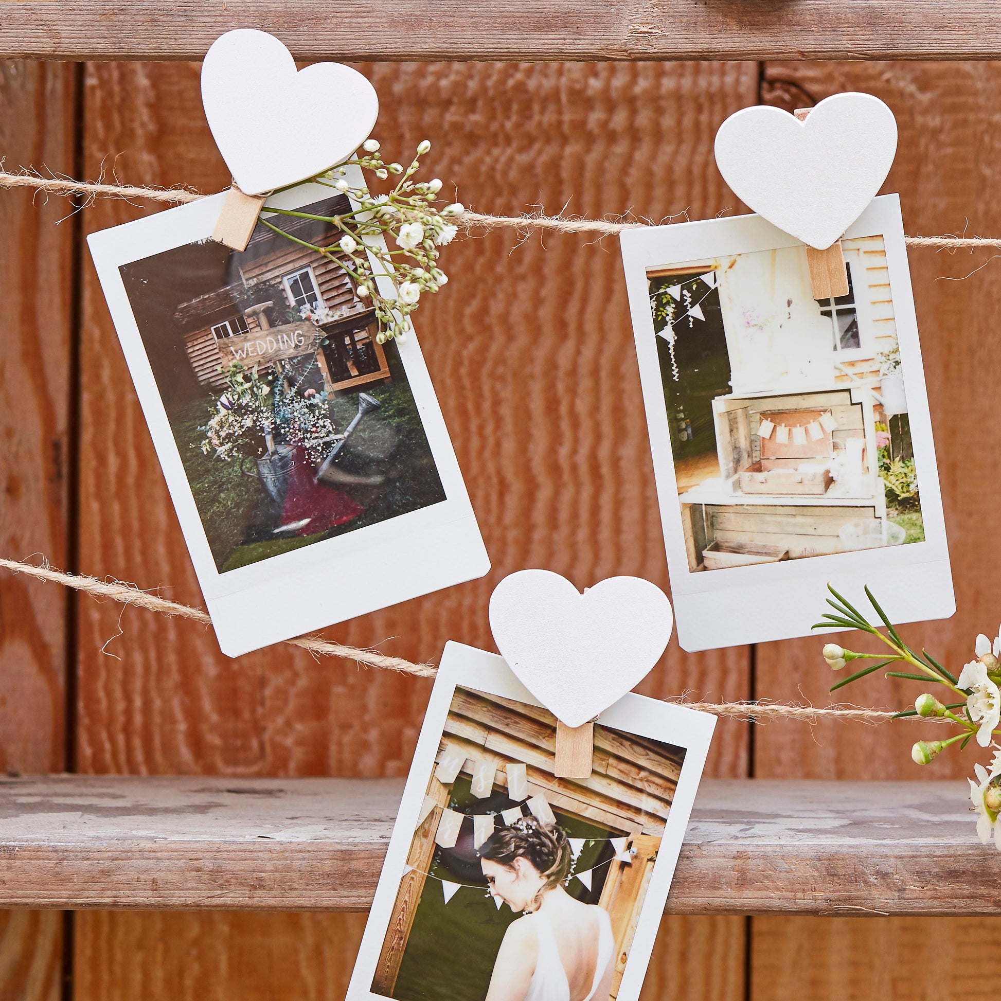 Easily hang the twine around your venue so guests can attach photos and cards. Why not make a photo booth area set up with our decorative accessories where guests can attach instant Polaroids to our heart and string kit.
