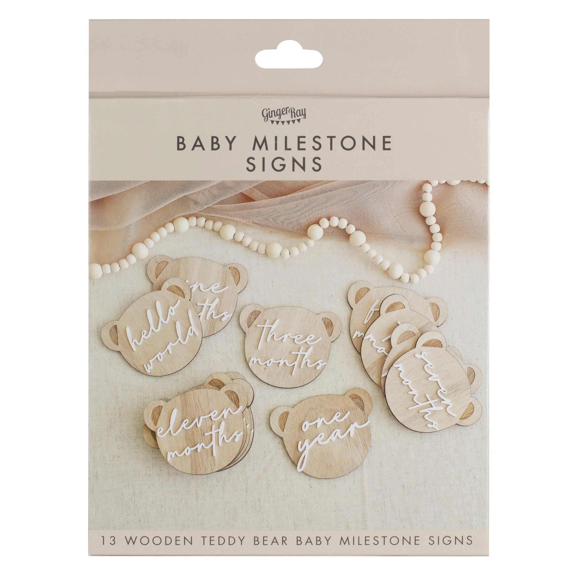 Each pack contains 13 wooden teddy bear-shaped baby milestone signs with white acrylic lettering, each measuring 8.1cm (H) x 10cm (W) and consisting of: