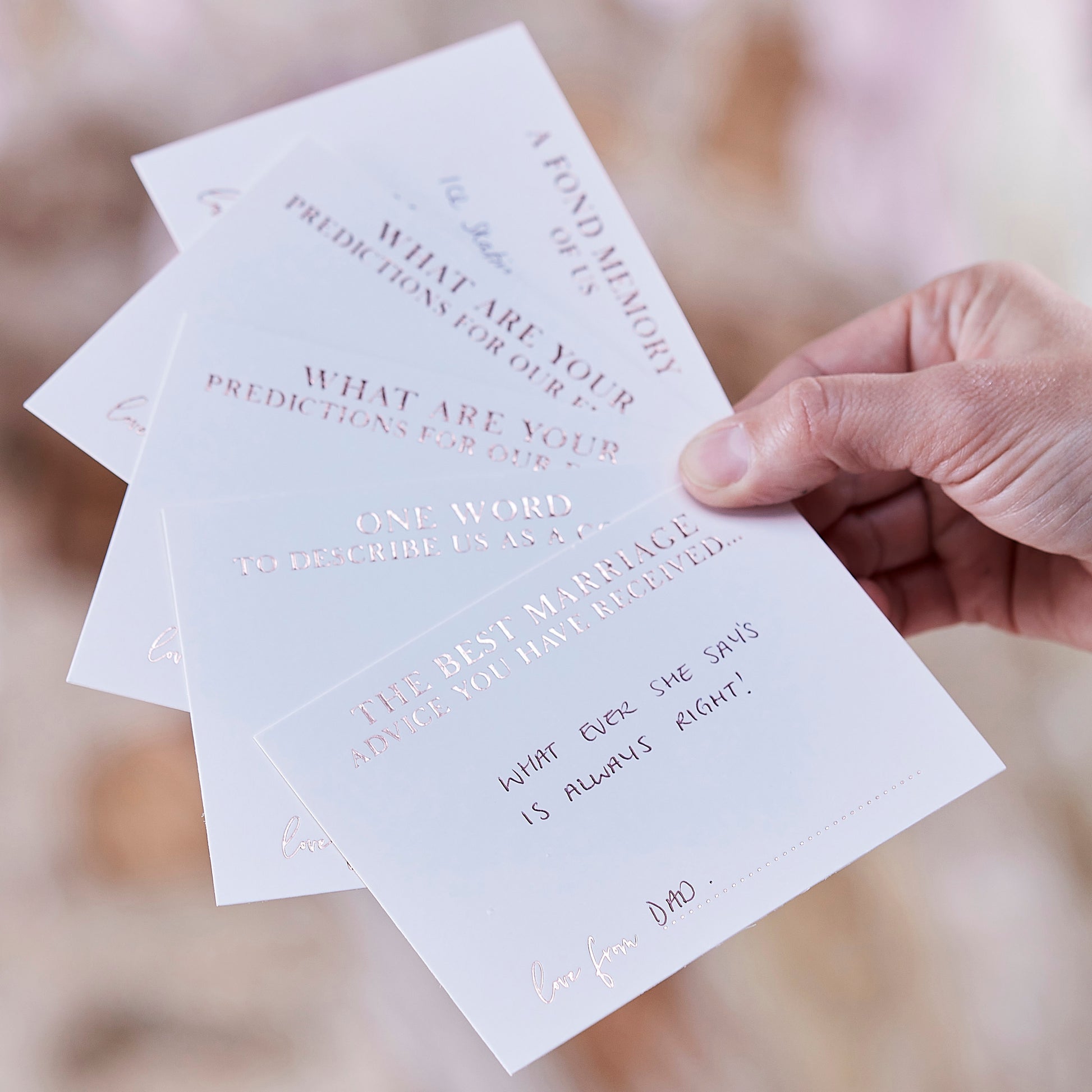 We know your guests will all be queuing to fill out the cards in our alternative guest book - each box contains 5 subdividers and each section contains 15 cards. Each section has tailored questions designed to give personal and meaningful messages for the happy couple.