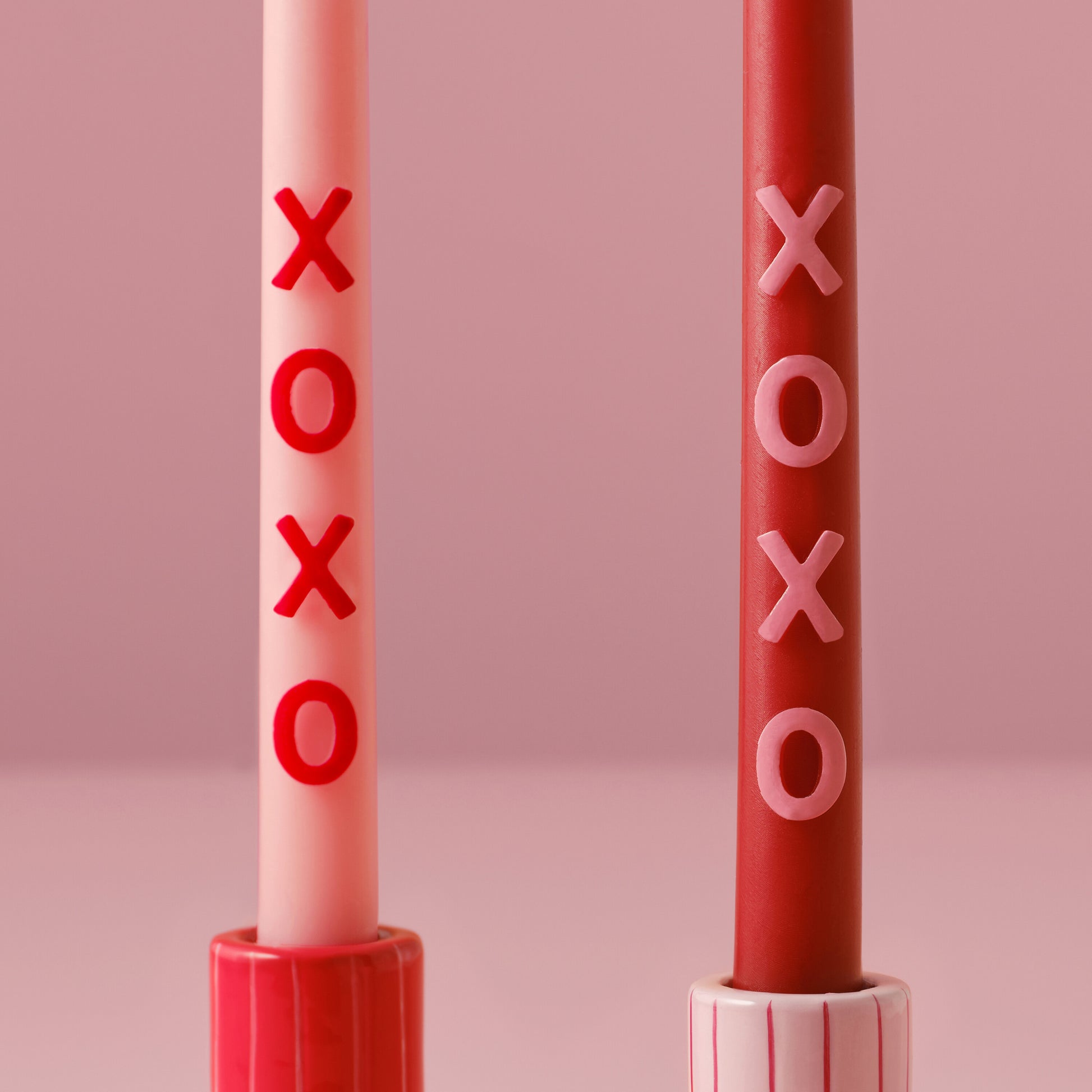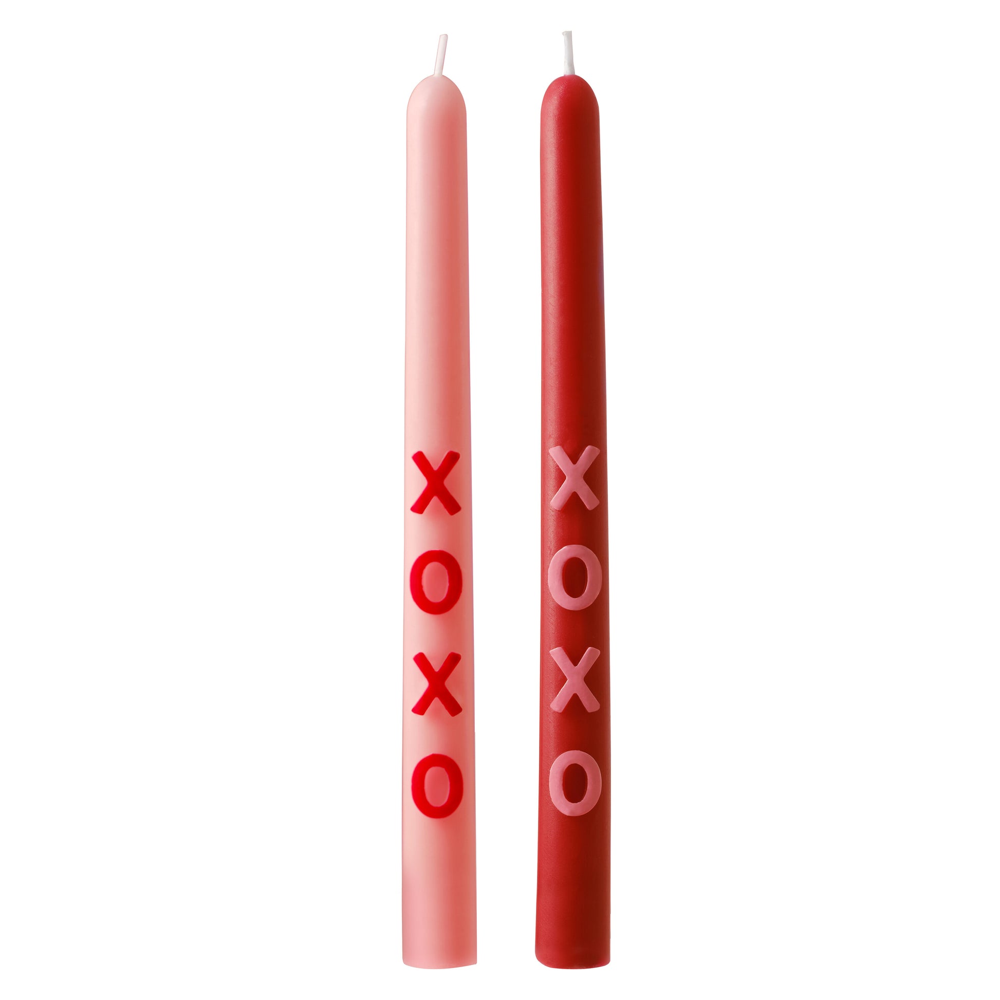 2 x pink and red 'XOXO' tapered dinner candles at 24cm tall by 2.2cm wide.